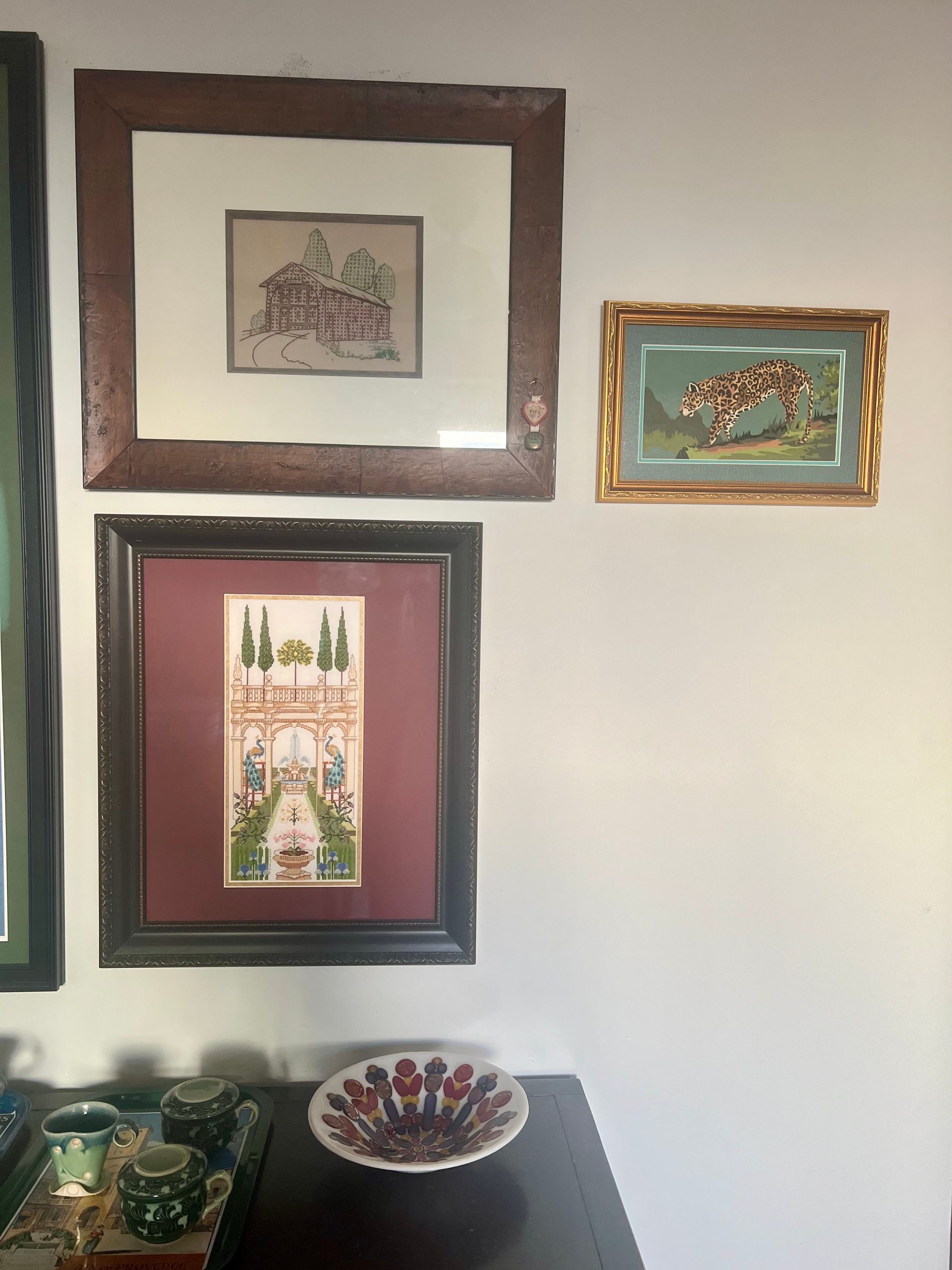 Recently, I am obsessed with making Artwork out of little family heirlooms. We all have things that have no value, little momento’s that sit in our drawers or cupboards or closets for years and years that we don’t know what to do with… but they were our moms or our grandfathers and we can’t get rid of them. Well recently I found in a pile of junk an old tattered paint-by-numbers on cardboard of a tiger and if it hadn’t had my grandmothers name and a date from the month I was born, I probably would have thrown it out. Instead I had it framed. Now it looks like a yummy, lush little 19th C. painting in a fabric mat and gilt frame. In the current environment when everyone is so concerned with wealth and luxury items and everything on social media makes you feel as if we all need to be making six figures a year it’s very entertaining to poke fun at the system by making something very beautiful out of something that basically worthless. You’ll end up spending more money on the frame than what the item was ever originally worth but I promise it is so fulfilling and you will find a new love and connection to your past or your family. I’d love to start a little business helping people do this.