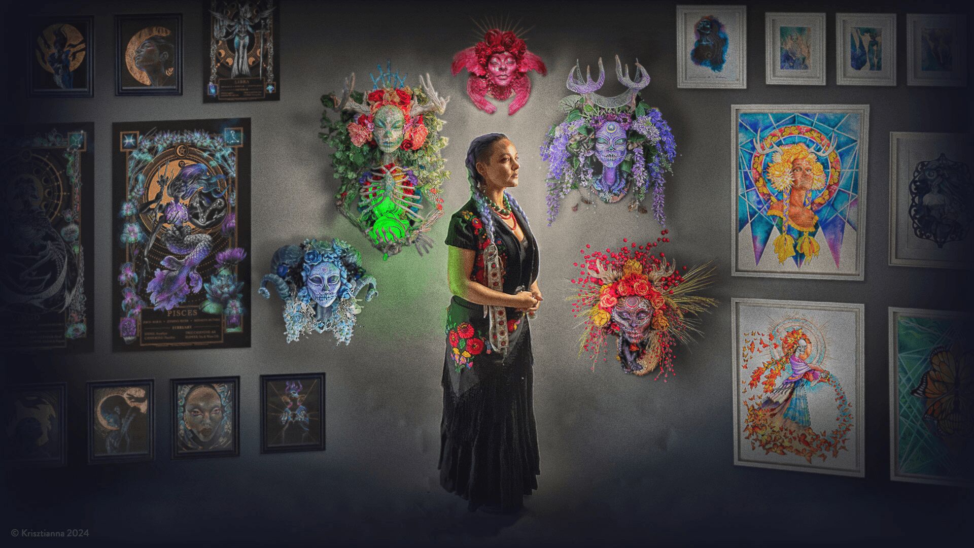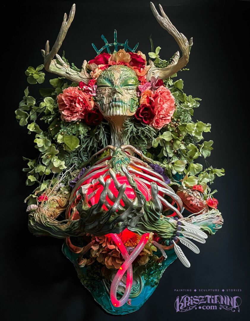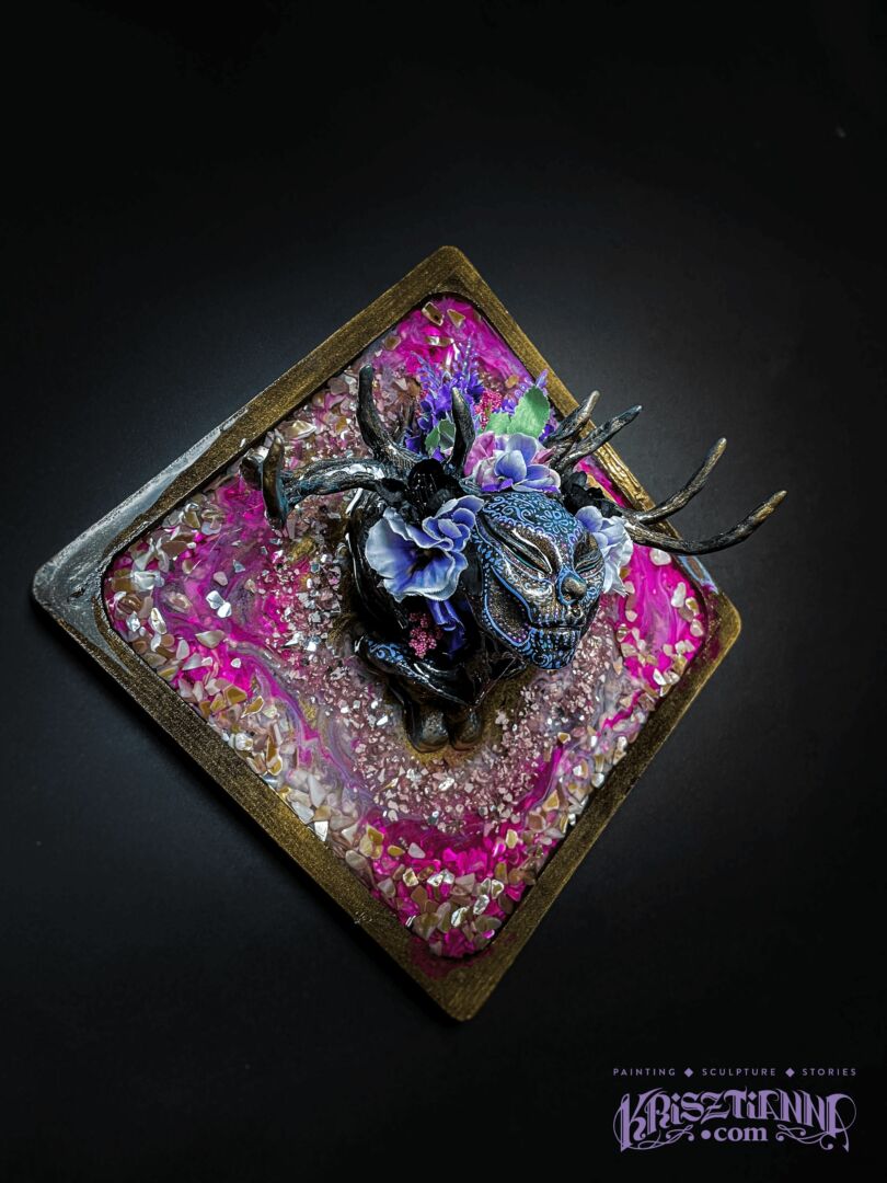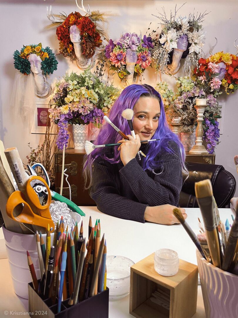 My work really spans mediums. My most popular pieces right now are called Muertitas, mixed-media sculptures of beheaded, antlered women adorned with flowers and Day of the Dead motifs. They embody the essence of nature spirits, serving as custodians of cherished memories of our departed loved ones. Despite the horrors inflicted on their bodies, they continue blooming and represent healing and protection. I also have a graphic novel done completely in graphite called Sleepless, which was a fantastic dream sequence I had, watercolor paintings of skulls and butterflies, a series in colored pencil and copper foil exploring healing from loss, and cute-fantastical-forest-creatures and kitties. Hopefully this gave you a bit of a peak into the breadth of the random.
