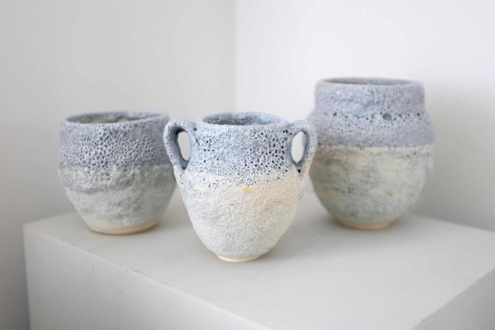 I went to art school for college, majoring in Fibers and Art History and after a few years, I realized the textile design work I was doing wasn’t making me happy and decided to go back to school for Fashion Design. I have always enjoyed having a career in Fashion and also creating my own work. I’ve come to learn that it’s important to me to have one foot in each world, fashion and art, in order feel like I’m satisfying the different creative parts of myself. My creative path has been one of exploring different mediums but with the same goal in mind – does this reflect who I am? My brand, Larsen & Lund, original started as an upcycled leather bag company but as my priorities and interests shifted, I have shifted the brand to instead be a vehicle of showcasing the art that I make. My focus has been illustration and ceramics but the ceramics are what I’m really excited about right now. The possibilities feel so open and endless. At the beginning of the year, after feeling like I’d hit a plateau with the ceramic pieces I was making, I started experimenting with surface textures and glazes. This was all because of a solo show that I’d seen at the gallery Nonaka-Hill, of the artist Masaomi Yasunaga that really inspired me. Before that I’d always only used two glazes and two variations of clay, mostly just to have some parameters for myself. After taking a workshop on sculptural glazes, I began making my own glazes at home, creating rich textures and craters. To me the final vessels look as though they’ve been unearthed from an ancient civilization. They give a feeling of a myth or story which I find really exciting.