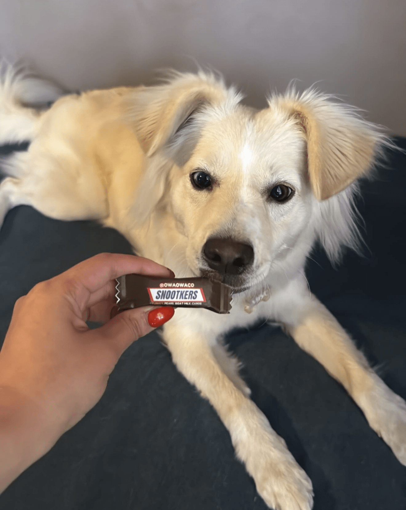 @my_chloe_pie for small white dog posing with bagged treats and chewrros