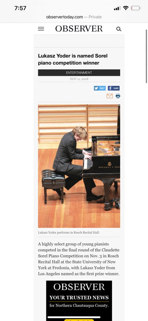 Lukasz is currently studying at the UCLA Herp Alpert School of Music on a full scholarship, under the tutelage Professor Inna Faliks, Chair of the Piano Department. He continues to be mentored by his mother, Roza Kostrzewska Yoder, as well as American Pianist Garrick Ohlsson.