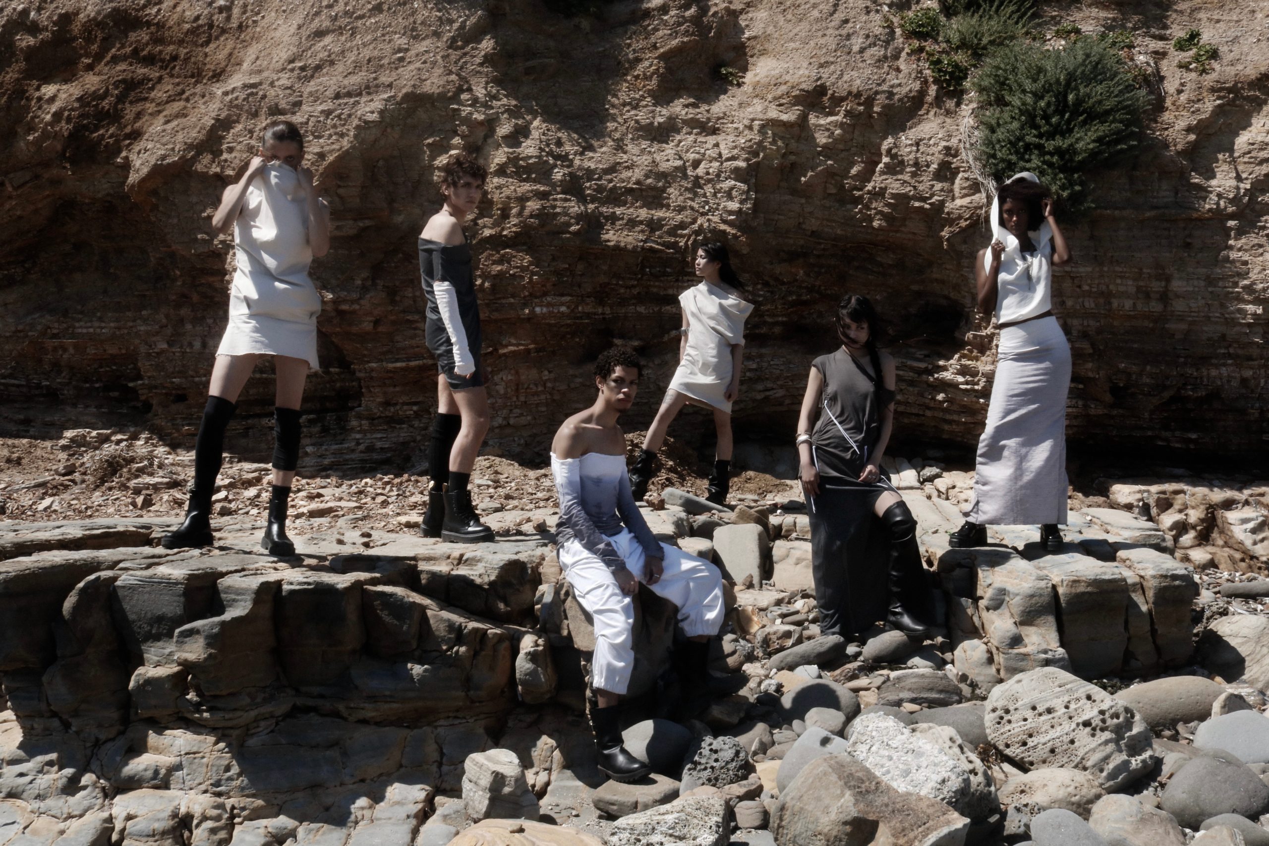 The Intemperance Editorial Photoshoot took place at Cabrillo Beach, where the rocky cliffs, sandy terrain, and frequent gusts of wind served as the perfect environment and world for our garments. The unique environment allowed us to fully immerse ourselves in the raw beauty of this location. Through careful composition and creative direction, we were able to capture the bold, gritty, and timeless elements that define the collection.
