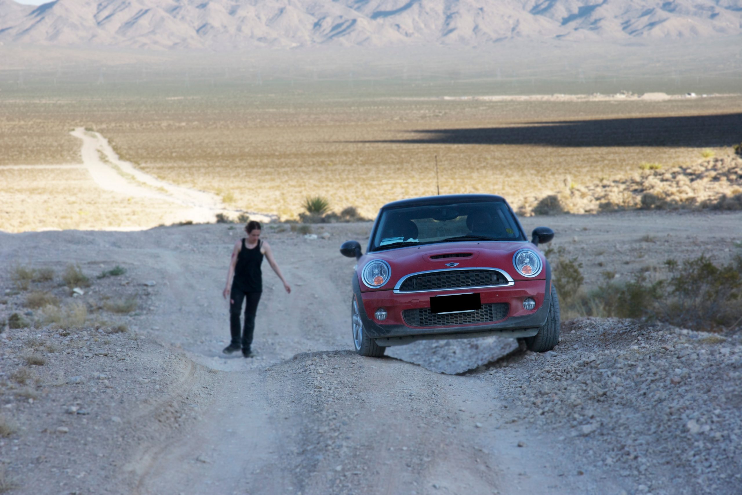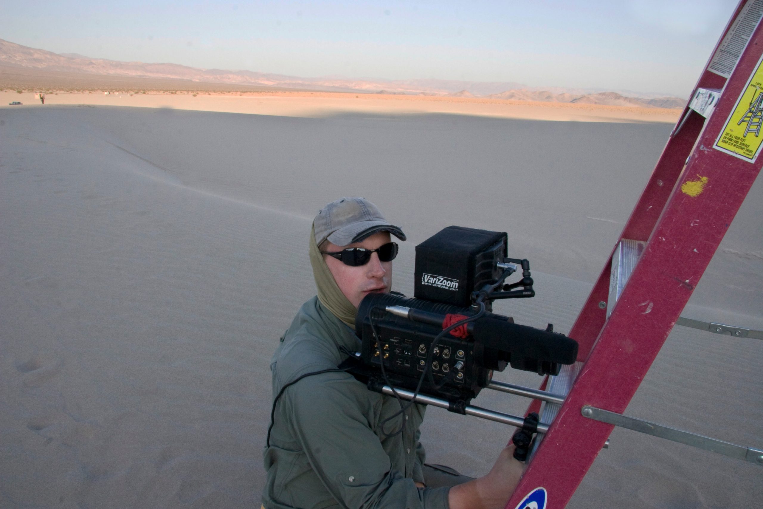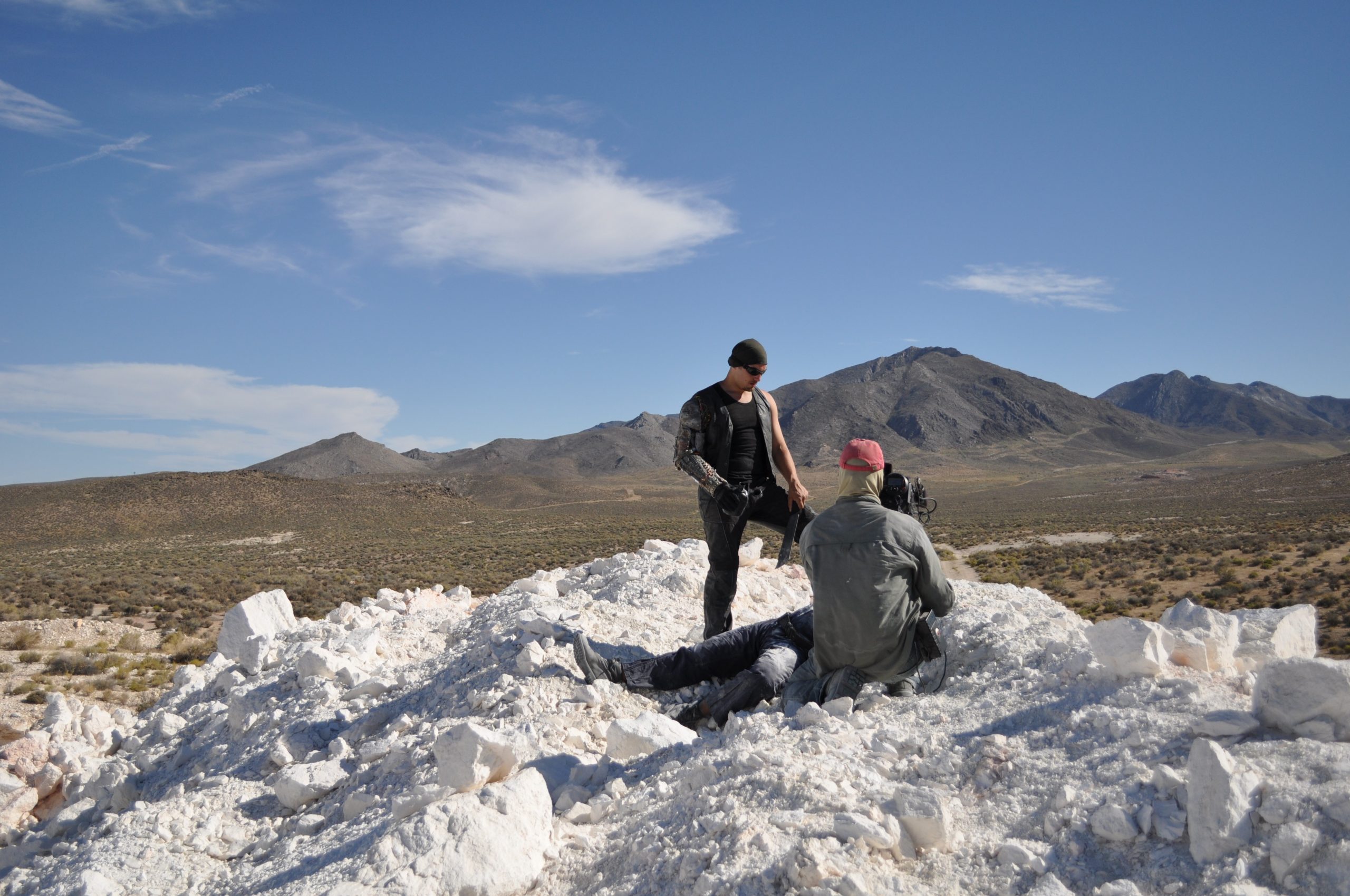 The good thing was it really looked like the apocalypse—there weren’t many dirt bikers out there in the heat leaving tire tracks in our world of zero vehicles. You could see miles in every direction and feel like you were alone on the planet. But the cheap Steadicam I spent two months’ income buying melted on the first day. Someone lost a very important bolt from the tripod and it fell apart. We couldn’t reschedule the actors, and all my vacation time for the year from my day job was locked in and I’d get fired if I tried to change it or came back to work even one minute late. So, I used a ladder instead of a tripod and did my best to make handheld not look handheld for the rest. We were fortunate to get to use a RED ONE camera, and it held up wonderfully in the heat and dust, but it sure got heavy as the days wore on. We knew the shoot would be hard, but it was so much harder than we anticipated. There was no way to shoot my ambitious storyboards with handheld as the only option. I had to throw the plan out and redesign every sequence in my mind just before shooting. Each morning, we scouted for the place we’d film the day’s work because it was so easy to get lost out there—you’d rarely be able to find the place you were yesterday. Some locations took a thirty-minute hike to get to. Everything was forced to be a certain level of spontaneous. But we were all very happy with how it looked, and the actors had an unforgettable time. Some lifelong friendships were made.