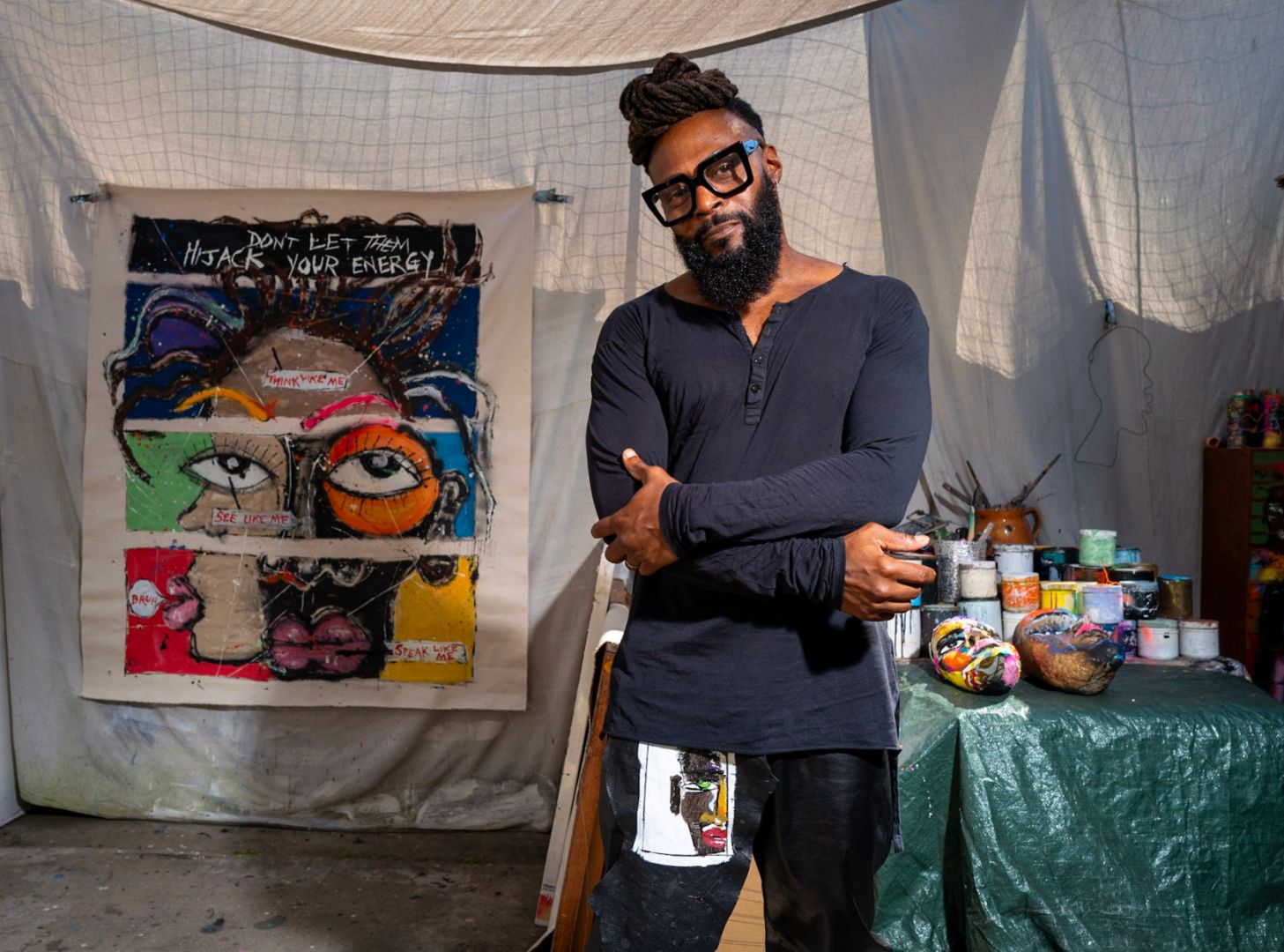 My art comes from my life experiences. It is a true peek into who I am. I am an aart activist and I am concerned about putting positive messages out there that can affect change and bring a sense of hope and healing. Every piece comes from a place of absolute authenticity. The style has varied over the years and I love experimenting with various mediums. One week I am hot on collage, the next I a m painting faces on fabric ofr clothing, the next its splashy large scale abstract canvas creations. Then I may switch gears and work on a song to accompany an AR or digital installation piece. Lately, I have found excitement working with sculptural creations. I figure if I am passionate and excited about what I create then there is a greater chance that it resonates strongly with those who are experiencing what I create. And right now I am damn excited about all that is coming out of my studio.