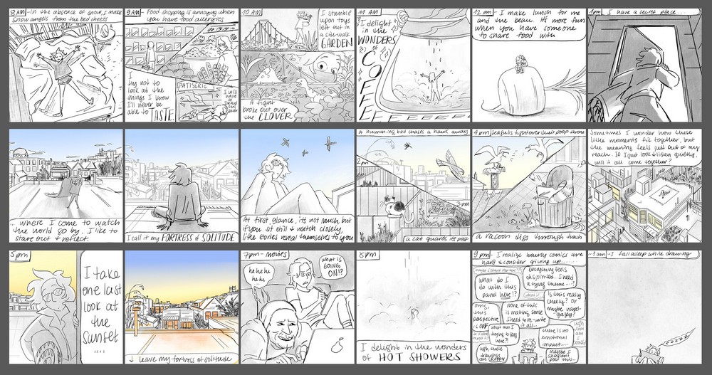 I’ve learned by wearing a few different hats along the way, but I started to feel burned out in the world of gaming. After some soul searching, I had been incorporating storyboarding and storytelling into my animation workflows, but I had never started from a blank page. I signed up for a night school storyboarding class to explore something new and it became a huge ‘aha’ moment for me! The things I made in that class gave me a sense of agency over my work, and it made me remember how much I loved turning concepts that are difficult to express into stories. Looking back now, it’s pretty easy to see how growing up as a shy child with a yearning for connection directly translated into my grownup interest in boarding, but sometimes the path isn’t clear until you reach your destination.