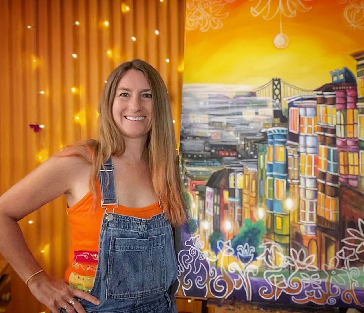 What has always been important to me are colors. The play of colors as they contrast or compliment each other is very exciting to me. It wasn’t until I started painting street scenes, playing with how light interacts with color on buildings and homes that I really found my niche. All of a sudden, I was noticing that my paintings were always about dusk, because I loved how the lights in the windows conveyed warmth and a welcoming environment. For this to work with the colors of the architecture, the sky would have to not be at its darkest. Lights are just turning on, the sun is setting and colors are still strong. Most of my collectors recognize this aspect of my work and can tell a piece is mine from the bright vibrant colors and the lights in a sunset sky. Something I’m really proud of is doing public art! I’ve worked on murals, public banners, and organized a public art outdoor show called The Mission Kiss. I started painting diverse couples kissing on wooden hearts and placed them around my neighborhood as a positive, joyful public art project. Other artists became involved and eventually I had over 100 artists, all placing hearts in trees on a given day as a covid safe, outdoor artshow. The people were encouraged to take the hearts home and donated what they could afford to the artists. It was a great success and we are doing another one April 18th! Becoming an artist at a professional level was not necessarily easy, but it was my goal and passion, so the hard moments also propelled me forward. I was mostly a single mom, and I accepted being low-income as a consequence. I wanted to show my son that you have to strive for your dreams. It’s not an easy road, but if you are in love with what you do, it softens some of the blows. I’m a very positive person and always know things do work out. This positive mindset has helped me keep moving forward, lick my wounds and keep going. Being an artist is constantly an uphill battle.. I don’t know if you ever get to “the top”, but the journey keeps it interesting! When people see my work, they feel the happiness I put into it. This is what I want them to take away from it. A happy, warm feeling.