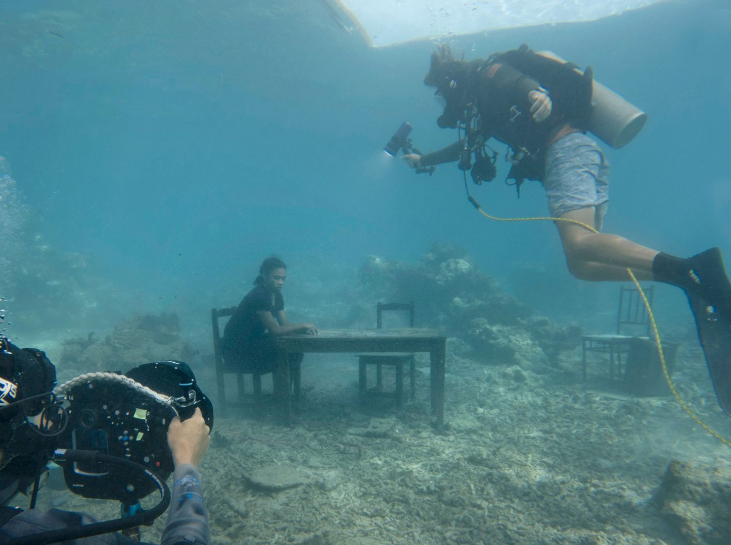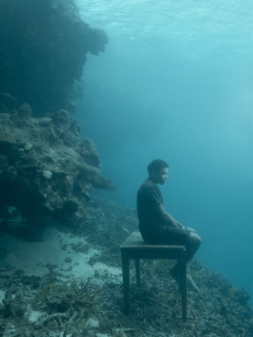 Nick Brandt photographing underwater in Fiji for SINK / RISE in 2023