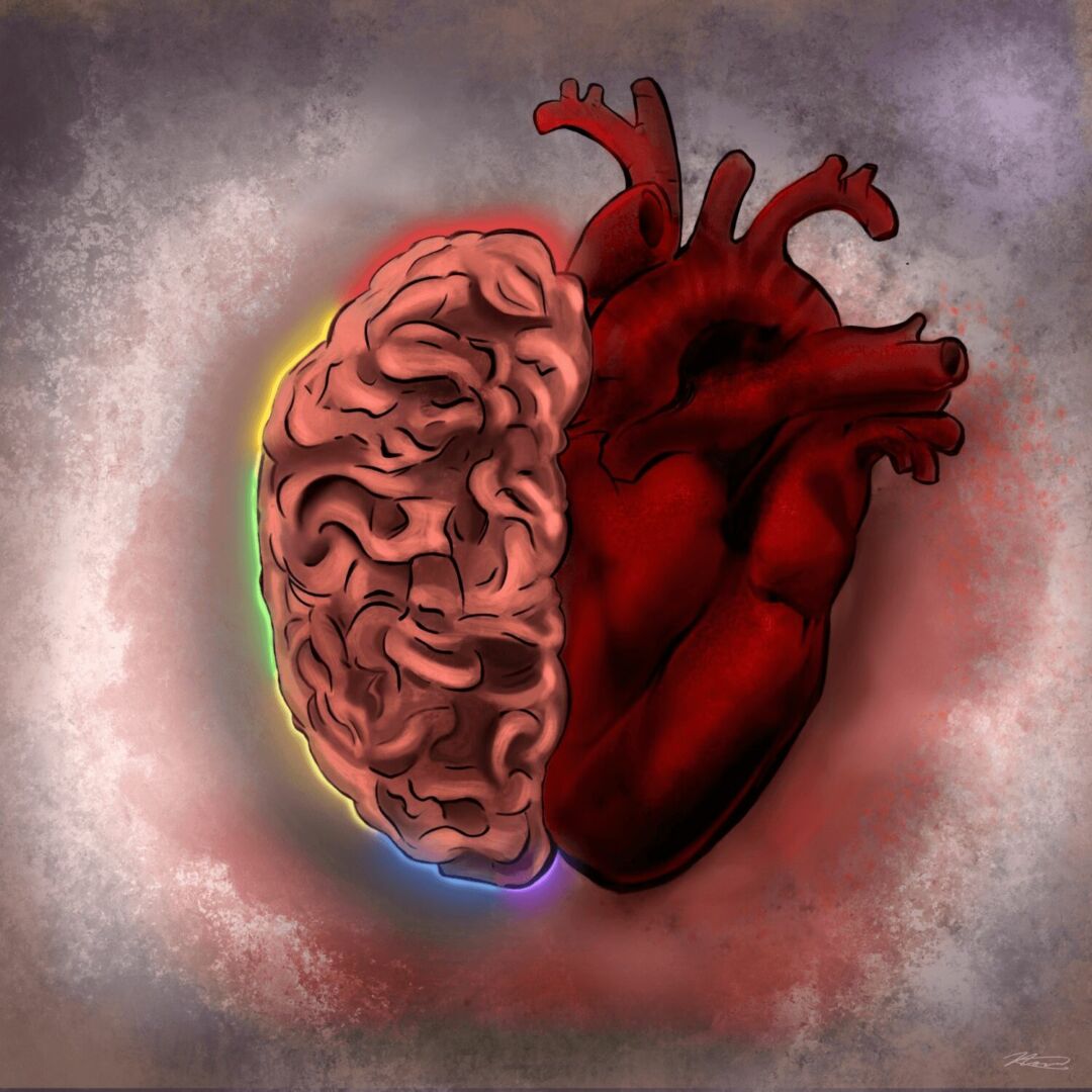 Digital art was fairly challenging because it was tricky to learn the program used to create it. However, once I was comfortable with these programs, it was a game changer. It’s amazing how many effects can be created with the layers and the huge range of colors that can be selected from. It was really amazing to transition from just doing traditional pieces to making digital artwork that could also be turned into an animation. Using the tutorials on youtube was beneficial to learning ways to make different parts of my art have glowing effects. A majority of my works have subjects in very bright, vibrant colors on a dark background. That can be seen in my piece titled, “Neon Sea,” with a glowing green fish swimming underwater. I’m exploring that as my signature style but I don’t want to limit my art to just that look. I’m most proud of my most recent album artwork for the hit single, “Sarah Tonin” created for the band ASE. The piece features a brain conjoined with a heart. There were many stages to turn it into what it is now and I’m so happy with the outcome. The heart has a very realistic quality to it and the last minute edition of the array of colors around the brain really brings it to life.