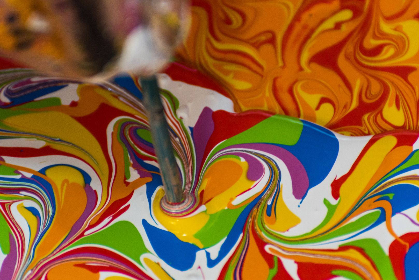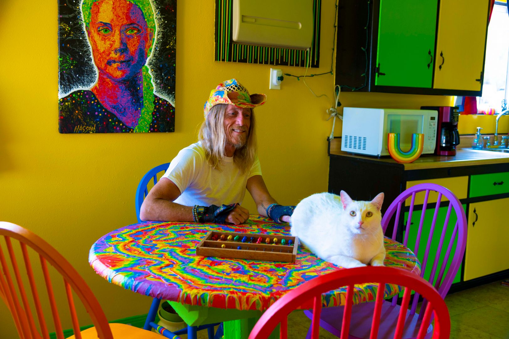 After buying my first house in Joshua Tree, I was doing A LOT of (house) painting. I was amazed at how a color of paint (specifically the colors of the rainbow) could absolutely transform a room and create a particular feeling. I’ve always been a fan of color, but having this large canvas to experiment on, a forgotten love of painting was unleashed. Now, I went to art school back in the day, but because I wasn’t very good at realism, I decided my talents would be better served making films. Because I didn’t have the money to decorate the walls of my first airbnb, I started buying $10 mini-guitars down on Olvera street and splattered them with rainbow-colored house paint. I also began painting abstracts at the time, throwing multi-colored house paint on large pieces of wood a-la-Jackson Pollock. The art was raw and instinctual, but it before I knew it, I was having my first show in Hollywood in 2016. Although I enjoyed the process, I didn’t feel that I had a truly unique style. It wasn’t until I decided to paint a linoleum floor in the RV I was living in that I had that breakthrough. I wanted to paint the floor using my custom colors (saturated hues of red, orange, yellow, green, blue, and purple), but I couldn’t use the paint-throwing technique on the floor because the paint would get everywhere. “What if I put each color in a squeeze bottle?,” I thought. I knew that would allow me much more control of the paint, and because I was using acrylic house paint, the colors wouldn’t blend together. I started squirting small colored blobs onto the floor, forming a mosaic pattern, but then I took a house nail and ran the tip of it through the various colored circles, creating very unique patterns. I then added small drips of paint into this developing mosaic and took a step back. I was so beautiful and unique and solely my own…that day ‘Dripping’ was born. It was then I decided to do a series of paintings using this style on portraits of desert rock musicians (Josh Homme, Brant Bjork, Mario Lalli, John Garcia, etc). A year later, my ‘Desert Dudes’ series opened at the Yucca Valley Visual & Performing Arts Center and the world got its first taste of my ‘dripping’ style. I’ve been painting obsessively every since, doing portrait commissions and working on my newest series–‘1969,’–which will feature portraits of the musicians (The Beatles, The Stones, Dylan, Hendrix, Led Zeppelin, Janis Joplin, Nina Simone, and Joni Mitchell) that made 1969 one of the greatest years in music. I’m also in talks with Behr Paint about possible sponsorship possibilities because it is my paint of choice.