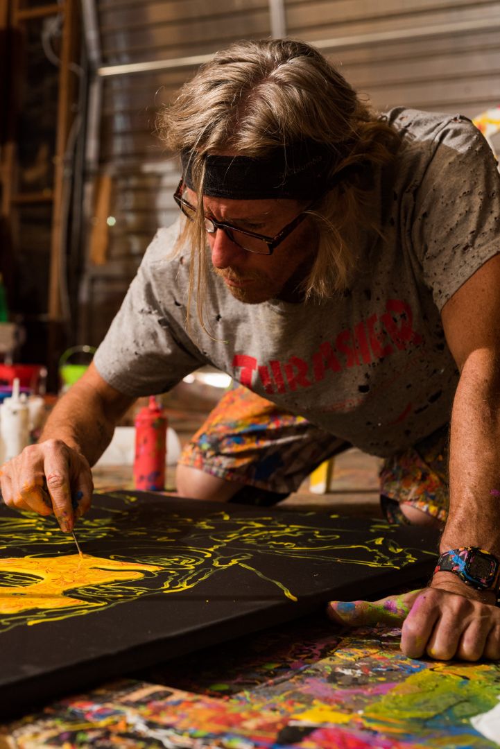 After buying my first house in Joshua Tree, I was doing A LOT of (house) painting. I was amazed at how a color of paint (specifically the colors of the rainbow) could absolutely transform a room and create a particular feeling. I’ve always been a fan of color, but having this large canvas to experiment on, a forgotten love of painting was unleashed. Now, I went to art school back in the day, but because I wasn’t very good at realism, I decided my talents would be better served making films. Because I didn’t have the money to decorate the walls of my first airbnb, I started buying $10 mini-guitars down on Olvera street and splattered them with rainbow-colored house paint. I also began painting abstracts at the time, throwing multi-colored house paint on large pieces of wood a-la-Jackson Pollock. The art was raw and instinctual, but it before I knew it, I was having my first show in Hollywood in 2016. Although I enjoyed the process, I didn’t feel that I had a truly unique style. It wasn’t until I decided to paint a linoleum floor in the RV I was living in that I had that breakthrough. I wanted to paint the floor using my custom colors (saturated hues of red, orange, yellow, green, blue, and purple), but I couldn’t use the paint-throwing technique on the floor because the paint would get everywhere. “What if I put each color in a squeeze bottle?,” I thought. I knew that would allow me much more control of the paint, and because I was using acrylic house paint, the colors wouldn’t blend together. I started squirting small colored blobs onto the floor, forming a mosaic pattern, but then I took a house nail and ran the tip of it through the various colored circles, creating very unique patterns. I then added small drips of paint into this developing mosaic and took a step back. I was so beautiful and unique and solely my own…that day ‘Dripping’ was born. It was then I decided to do a series of paintings using this style on portraits of desert rock musicians (Josh Homme, Brant Bjork, Mario Lalli, John Garcia, etc). A year later, my ‘Desert Dudes’ series opened at the Yucca Valley Visual & Performing Arts Center and the world got its first taste of my ‘dripping’ style. I’ve been painting obsessively every since, doing portrait commissions and working on my newest series–‘1969,’–which will feature portraits of the musicians (The Beatles, The Stones, Dylan, Hendrix, Led Zeppelin, Janis Joplin, Nina Simone, and Joni Mitchell) that made 1969 one of the greatest years in music. I’m also in talks with Behr Paint about possible sponsorship possibilities because it is my paint of choice.