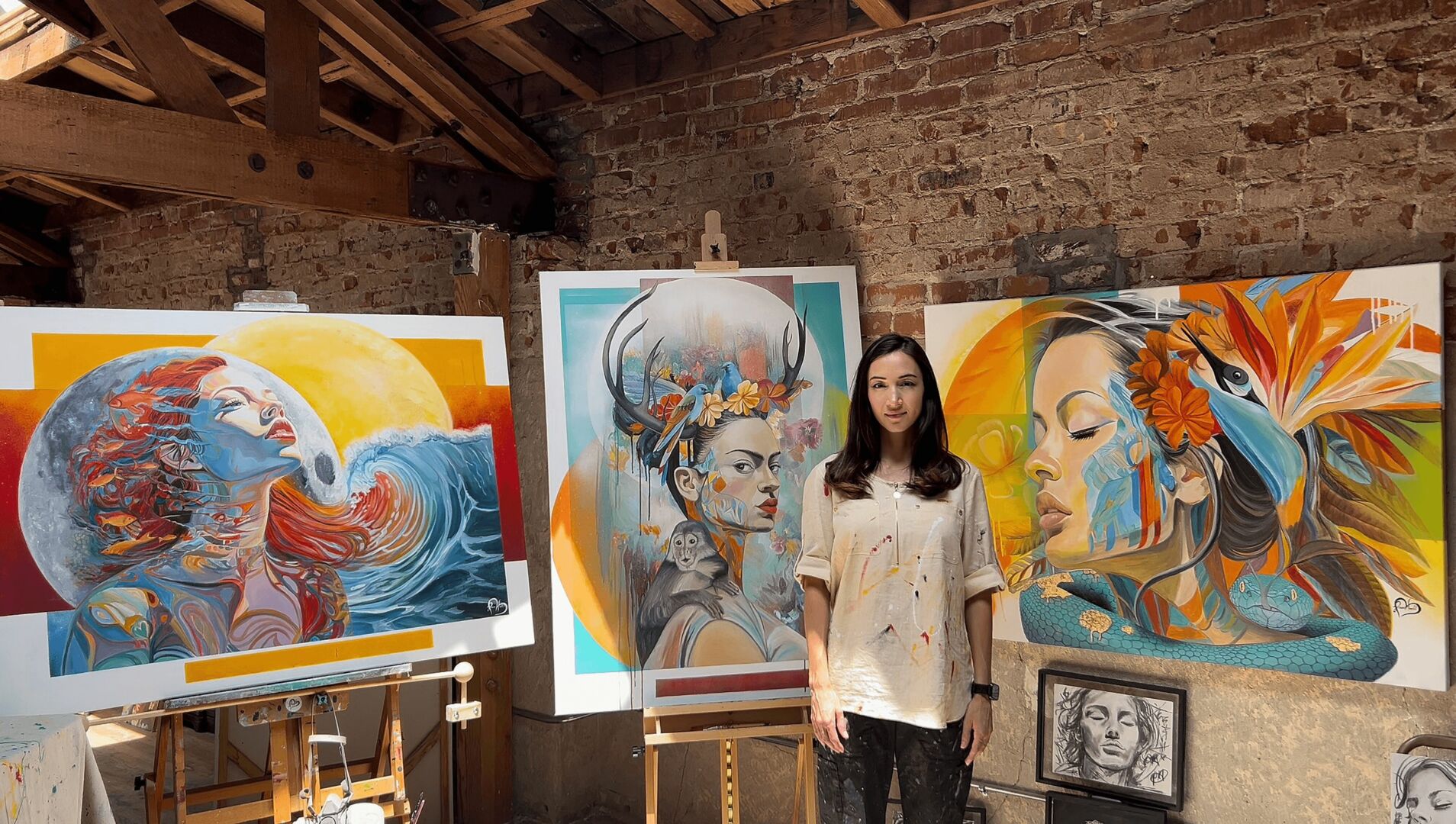 In my new series launching this year, I strive to highlight female divinity and empowerment. The artwork often features serene poses set against elements such as the moon and sun and incorporates symbolism through colors, flora, and animals. This series aims to showcase the unique strengths of femininity and our connection to the nurturing environment. There is a political movement attached to the walls and canvas I paint, often with messages of empowerment, education, history, gender, and equality. I believe in the power of art to heal and bring harmony to public spaces. My goal is to create art that resonates with people, promotes unity, and enhances the environment around it.