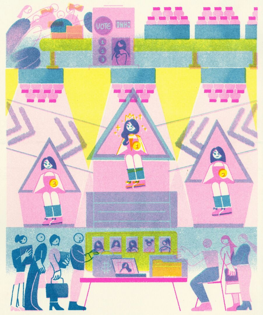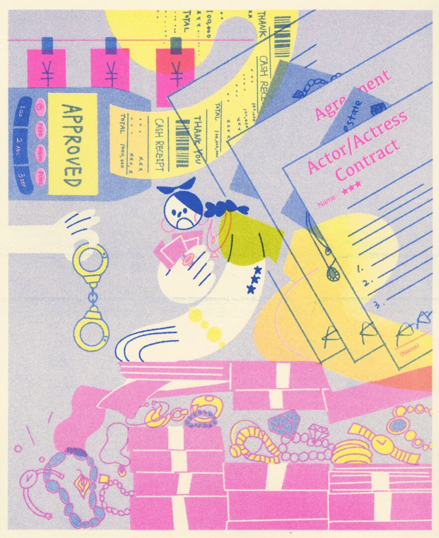 At that time, I was introduced to Riso printing, which immediately fascinated me. I decided to incorporate Riso’s colors into this project and eventually printed the series using a Riso printer. The unique texture and misalignment that Riso offers made the images richer and more layered, effectively highlighting the glamorous yet often superficial nature of the entertainment industry.