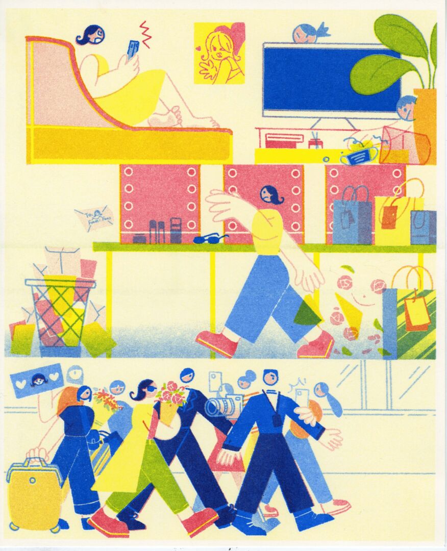 During the creative process, I gathered a large amount of gossip from the internet and selected a few typical examples to illustrate, such as infidelity, domestic violence, and fake eating in dramas. Initially, I used smooth lines and a generally gray color palette. However, I realized the artwork lacked visual impact and appeal. I decided to remove many of the lines, make the edges less smooth, and use software to change the colors and add texture. Despite these changes, the pieces still felt incomplete.
