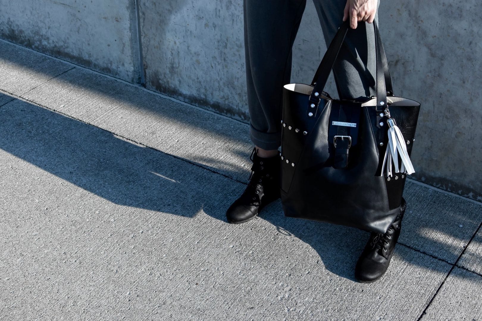 I first became interested in leather, my primary medium/material, during college. I attended Columbus College of Art & Design for fashion design, and one of my classes was focused on specialty materials, in which we had a project to create a garment or accessory out of leather. I decided to make a corset, which is a difficult project in and of itself, let alone out of leather! Despite the difficulty, I had a fantastic time with the project and was definitely hooked on leather as a material from then on. Later, I did an independent study for a semester based on continuing to work more with leather and to explore designing bags and accessories. I’ve always been drawn to the technical aspects of fashion design, and working with leather as well as designing items like bags has tons of technical and almost puzzle-like elements.