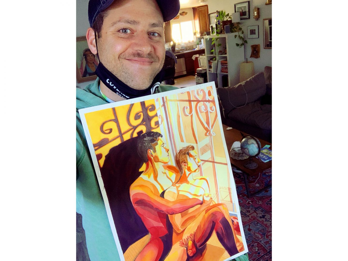 I am a watercolor painter specializing in bold, homoerotic themes and colors. The bright and vibrant choices I make are an expression of my soul and the fire that burns inside me. I love being a gay man and am really proud of the culture and community that I am a part of. The subjects of most of my work are gay men as well, in various stages of undress, most often completely nude. I love this vulnerability and the sexiness that is associated with it. I also realize that this subject matter can be judged and perceived as overtly sexual or even “inappropriate” (whatever that means *eye roll*) by some, but I believe that when interpreted with an abstract element of color and my style, the material becomes more accessible and less “threatening” to the viewer. I also feel very lucky that my one on one work with clients (I deal with mostly commissions and custom requests) often leaves them feeling very empowered and confident in their skin, and in many cases I am told that they feel free and authentic and beautiful after seeing the final work and THAT makes me feel really good. I love to leave people feeling better than they did when they woke up 🙂