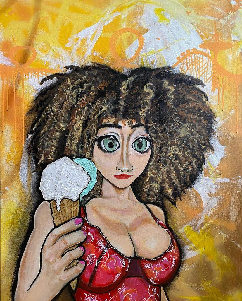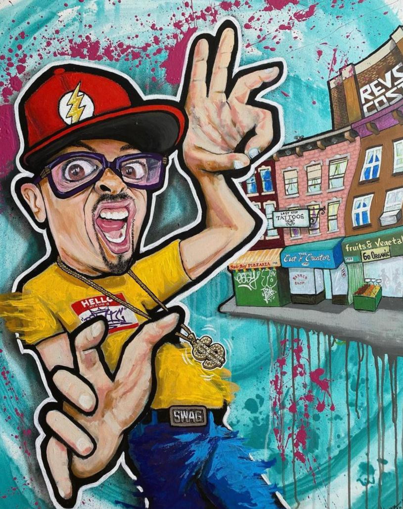 My current works of art incorporate various elements such as; graffiti, character illustration, street flavor and strategically placed paint splatters. The splatters provides movement and energy to the pieces. My signature characters give off that graffiti vibe with oversized heads, hands and sneakers/shoes. I inspire to be a visual story teller for the audience/collector. The titles to my pieces are simply an introduction to your imagination. Inspirations are many: Ron English, David Choe, George Condo, Kaws and Dragon76 just to name a few.