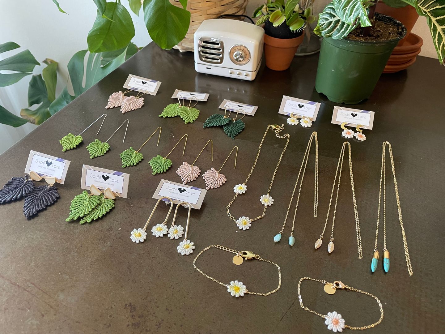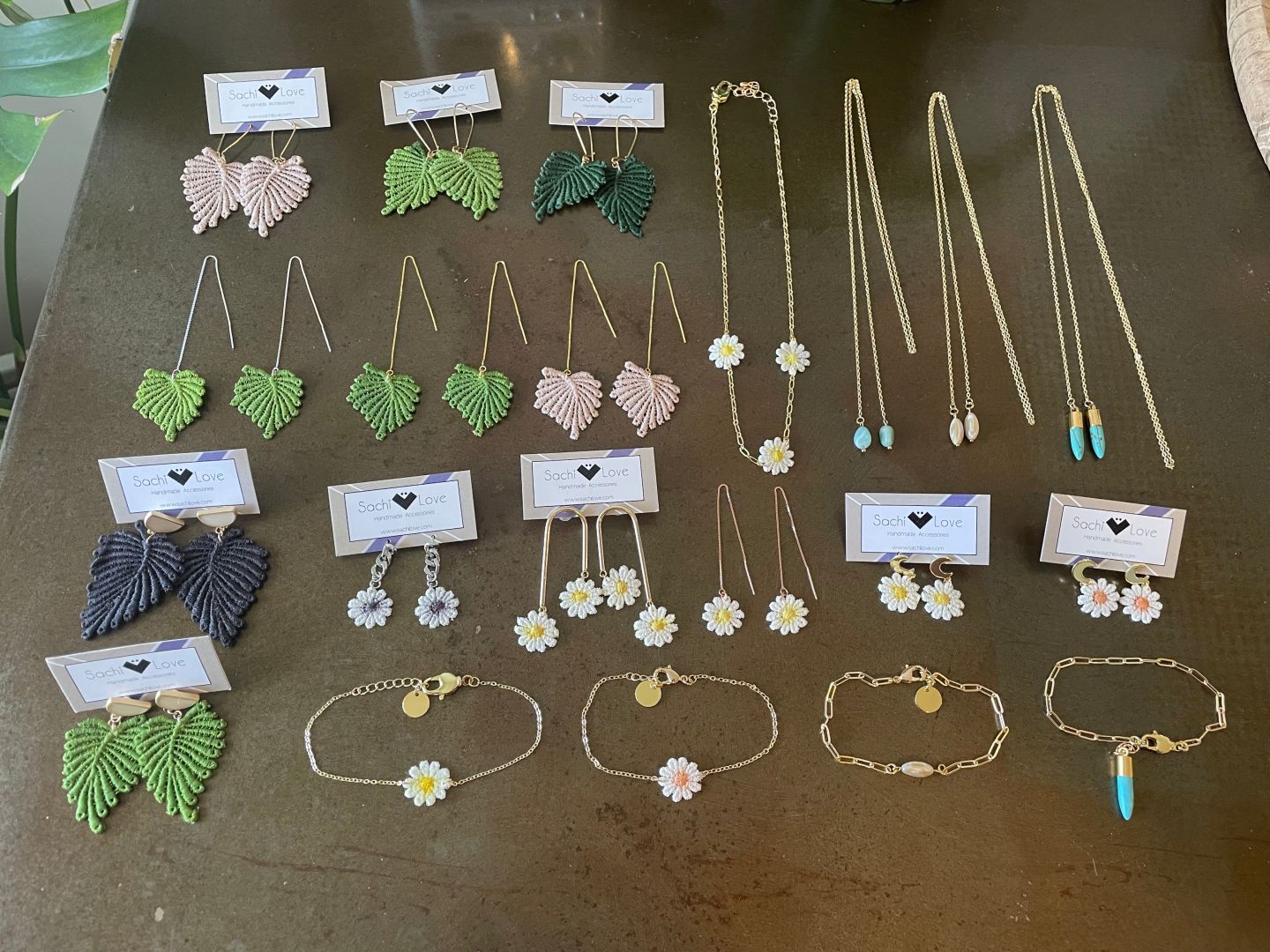 I source these lace locally in LA and I hand-pick lace trims when I am traveling. So these laces comes from all over the world including Japan, Europe and India. Most of the laces are white, so I hand dye and hand paint each pieces so they are one of a kind and no two are exactly a like. Sometimes, depending on the colors, I have to hand-dye two or three times so it’s time consuming because you have to wait for the lace to dry but I enjoy the process. After the lace is dried, I add organic solutions so lace stays slightly stiff and they don’t come apart. Once the lace is set, I cut the lace to desired shape and assemble together using the highest quality posts, chains, metals, and ornaments. I believe in quality over quantity and it’s important to not rush things when you want something to be made well. One of things that people love about my jewelry is how I incorporated lace because it’s not something you see in jewelry and it makes it unique. Also, people are surprised by how light and comfortable my earrings are they don’t pull your ears when you wear them out. People even tell me that they forgot that they had the earrings on because it’s so light and comfortable. They’re great statement piece that you can wear them everyday and you can also wear them to dress it up. Over the years, I have branched out to making bracelets and lariat wrap necklaces. My best sellers are my daisies and palm leaves laces.