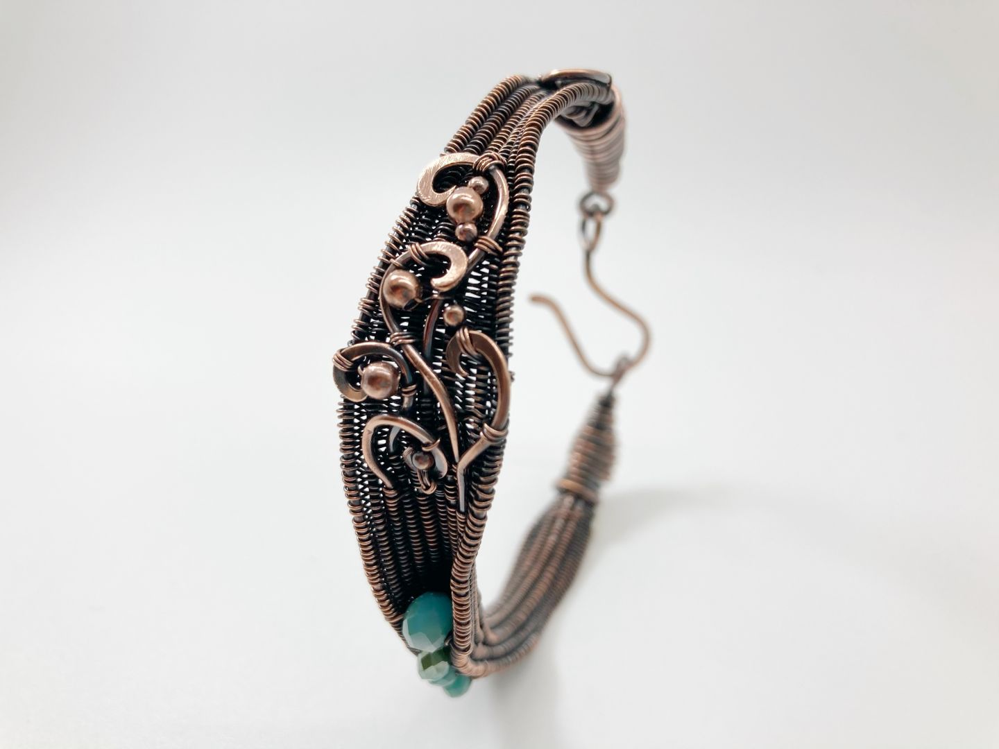 I make wire woven jewelry exclusively from copper wire. I believe what sets me apart is the fact that 95% of my pieces incorporate complex weaving techniques. This makes my pieces incredibly intricate with a high level of detail and focus on craftsmanship rather than gemstones. This is why I often don’t include any precious stones or just small accents. This is also part of the reason I decided to use copper wire and not any precious metal: I want my clients to love the intricacy and craftsmanship, not the value of the materials. Also, I find the reddish color of copper incredibly beautiful. In some of my work, I incorporate upcycled items, specifically old nail polish. My signature items are pendants and earrings made from glass stones that I hand paint with upcycled nail polish and then wrap in copper wire. I am very proud of my ability to make these intricate pieces even though I am still learning. I am developing my own style and it’s a journey that is accompanied by many tutorials from other amazing artisans. Without the community, I couldn’t be where I am now. Getting here was a big mix of trial and error, YouTube videos, books, and many conversations on Instagram and Facebook. One of the biggest lessons I learned is that you can overcome any challenge if you just try hard enough. Or maybe better said: often enough – repetition and perseverance.