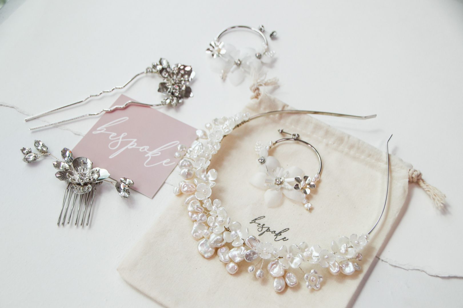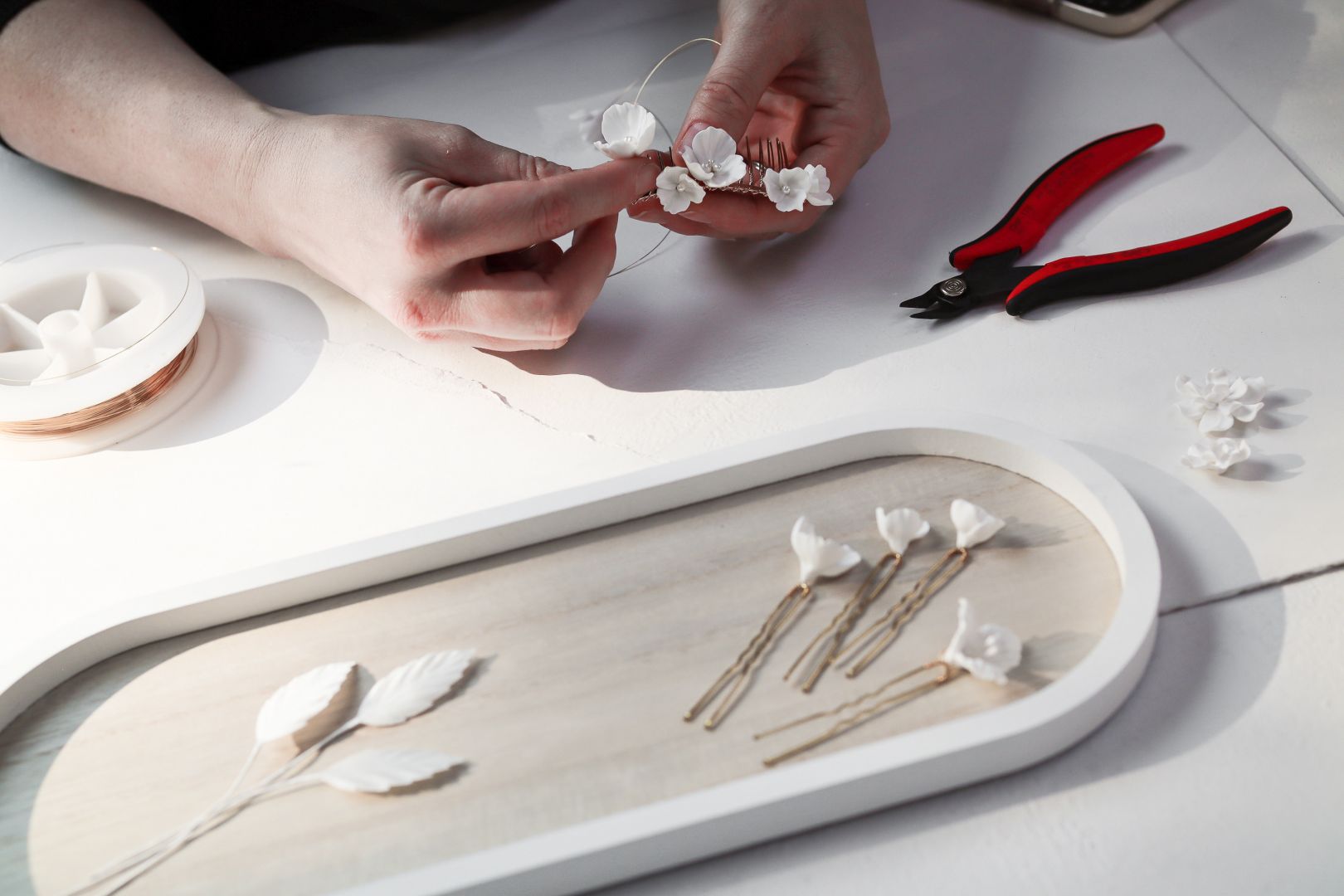 I make handmade bridal accessories. Making custom accessories helps brides cut through the noise of what they should be wearing and instead focuses on what a brides wants to wear on her wedding day. I create collections of my own designs featuring silk flowers, rhinestones, glass beaded leaves, clay flowers, and pearls. These collections can be purchased as designed, or I can collaborate with brides to create one-of-a-kind pieces.