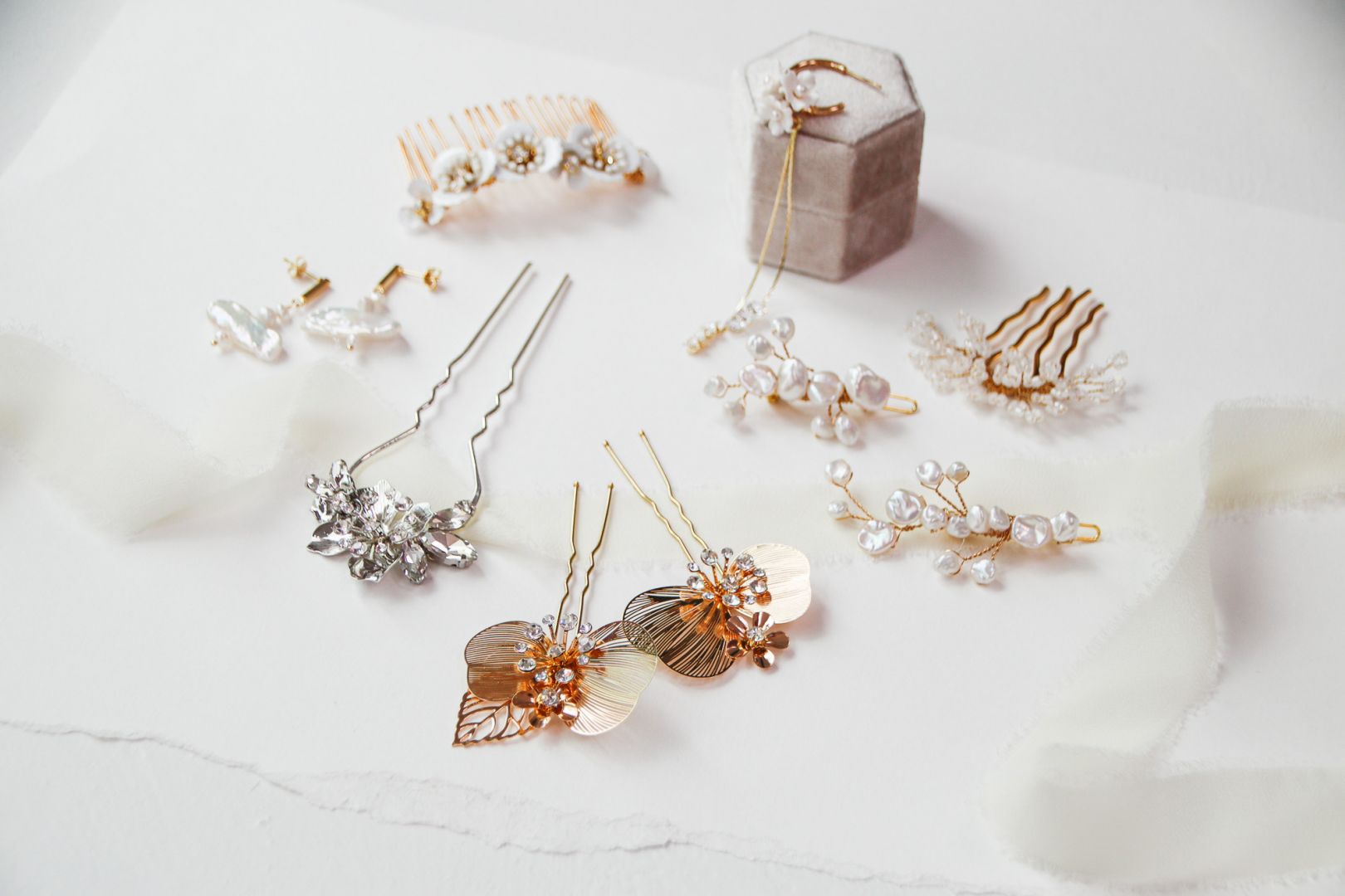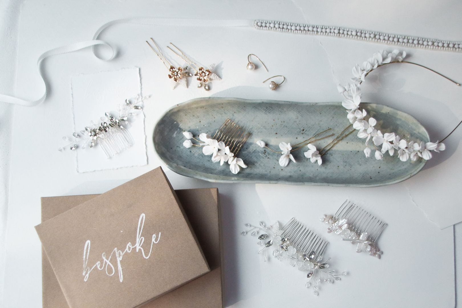 I make handmade bridal accessories. Making custom accessories helps brides cut through the noise of what they should be wearing and instead focuses on what a brides wants to wear on her wedding day. I create collections of my own designs featuring silk flowers, rhinestones, glass beaded leaves, clay flowers, and pearls. These collections can be purchased as designed, or I can collaborate with brides to create one-of-a-kind pieces.