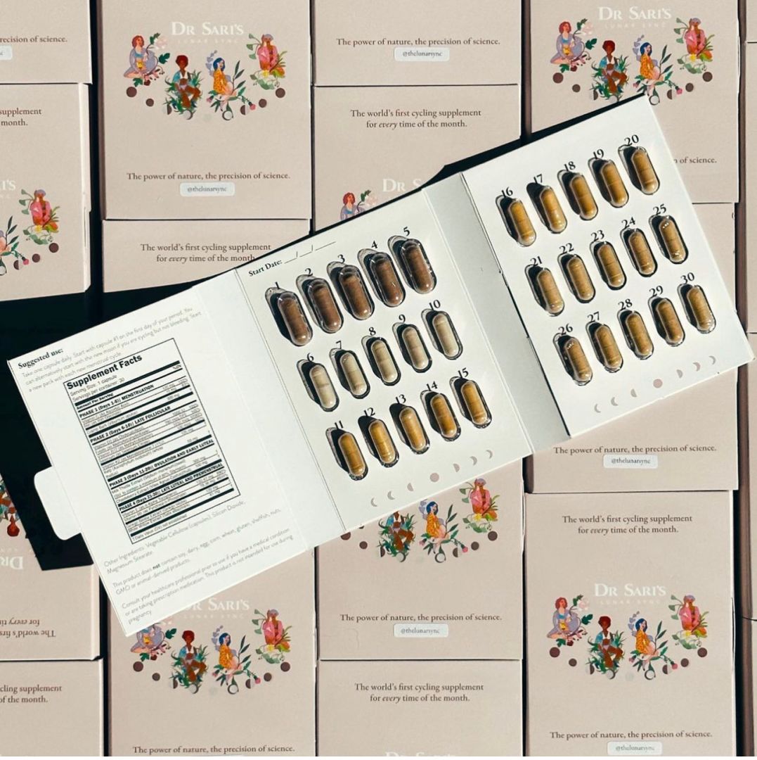 In early 2019, I went to a beautiful sound bath and had a vision: it was a supplement pack numbered 1-30 with different formulations specifically designed for each phase of the cycle. So all you have to do is start a new pack on the first day of your period, and you are getting exactly what you need, when you need it. I went to work poring over hundreds of clinical studies and developed the unique Lunar Sync formulations for each phase, then I tested them in a trial of 60 women over 90 days and was so blown away by the results that patented it and made it available for everyone.