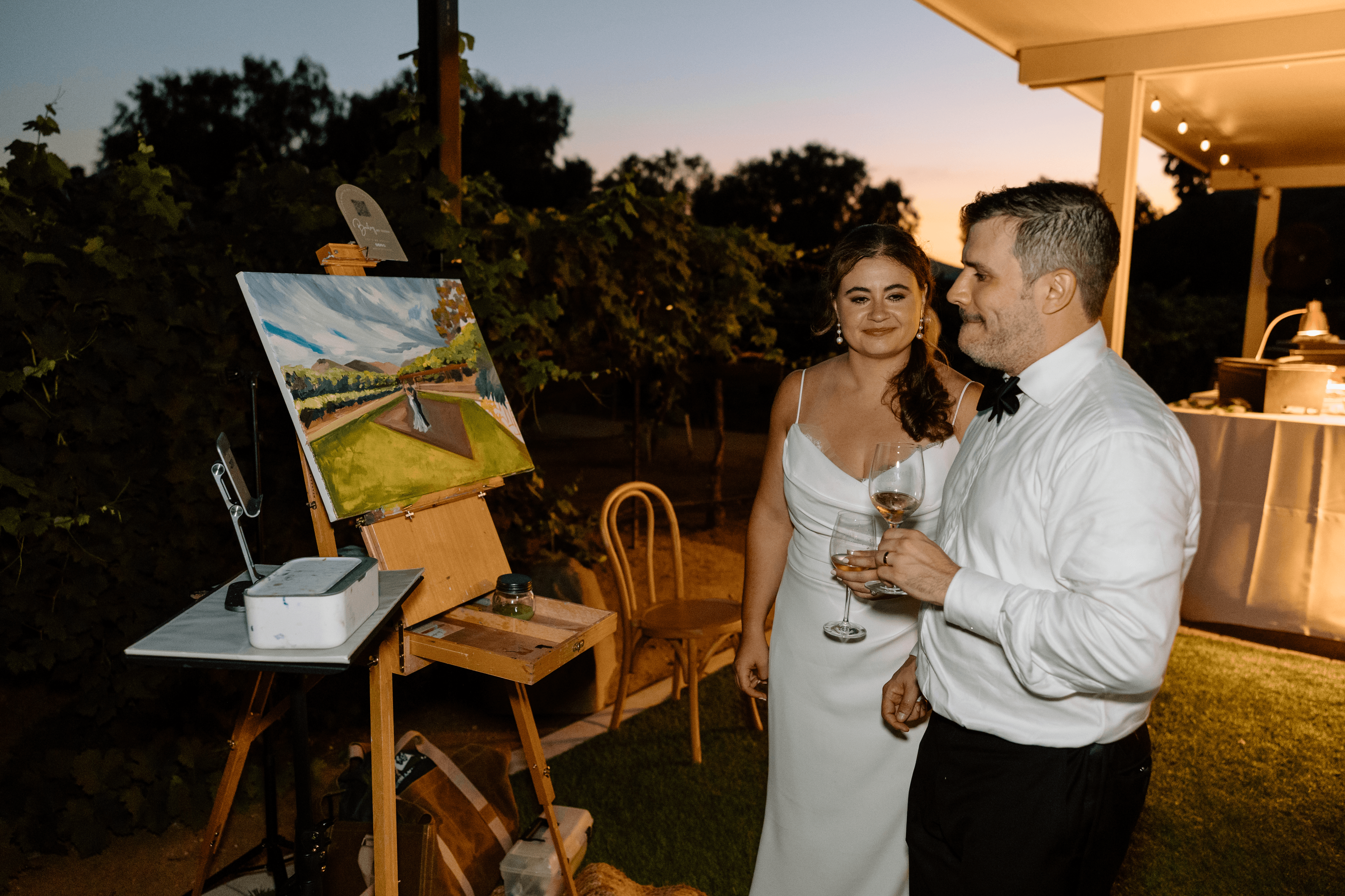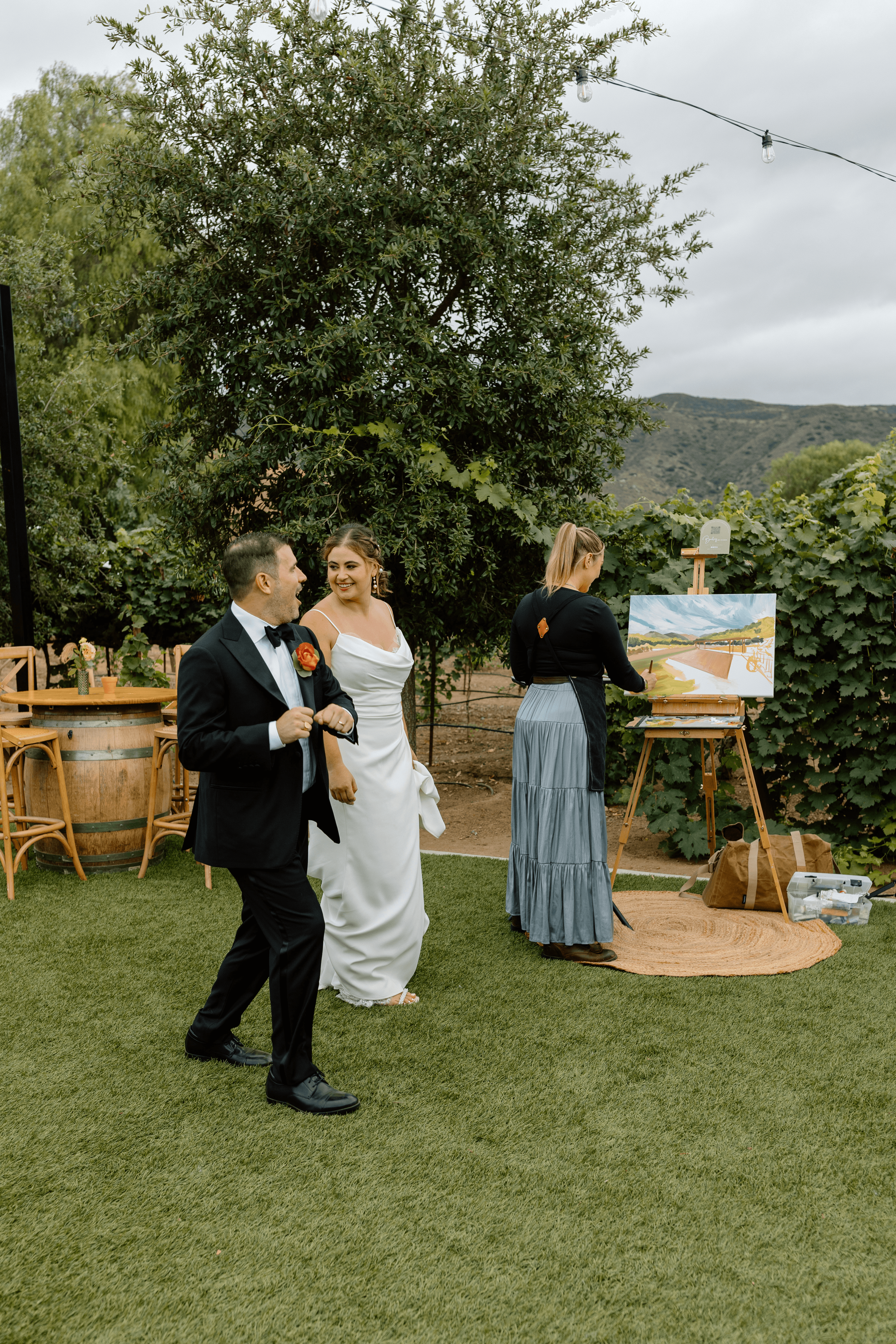I think what blows my mind about live painting is that it ultimately a grouping of some of the most difficult tasks an artist can take on. That is something that even I didn’t understand at first, despite having been an artist for most of my life. If you ask any professional painter, painting live with changing lighting and shadows is one of the trickiest obstacles you can face. That’s why the subcategory of plein air painting, or painting in open air, has so much prestige around it in the art industry. On top of that, painting for a live audience is somewhat unheard of in the art world. You’re adding in variations in your environment that you can’t control, tipsy guests getting a little too close to the canvas, answering complex art questions while you’re painting with a time limit. Keep in mind that most artists do either landscapes OR portraits, it’s rare that an artist has mastered both. Then you add in that painting white and black fabric is one of the most difficult things a portrait artist can take on, and now you are including a bride and groom in those colors in ever unpredictable lighting conditions… it’s really about as complex of a combo of painting skills as you can get.