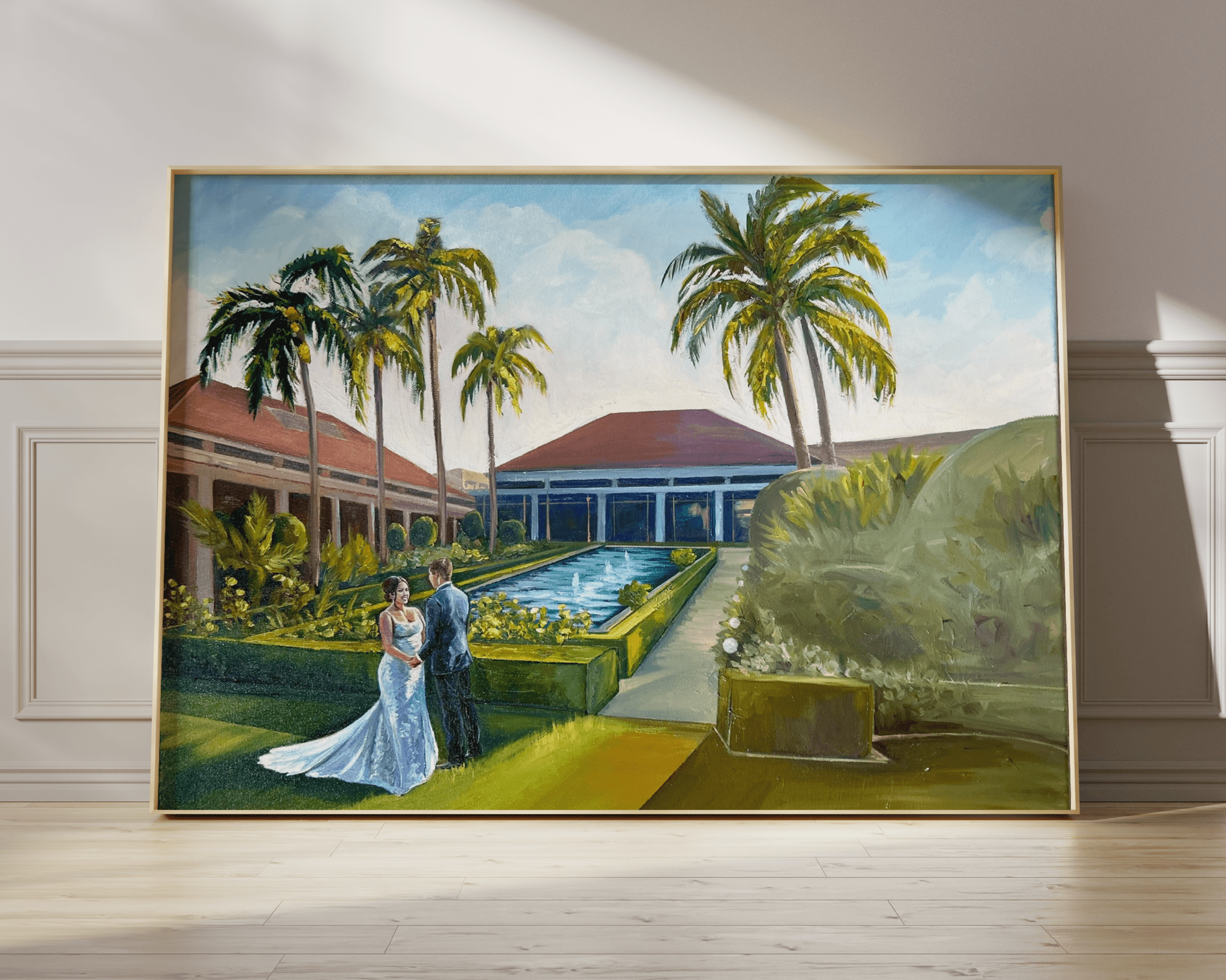 Any good artist will tell you that there is always more to learn. I look at a finished painting and I don’t see what others see, I see all of the struggles and obstacles I faced while creating it, and think of all of the ways I can improve next time. One of the most difficult parts of being a full time artist is presenting your work as if you are completely happy with it, despite the fact that one of the literal definitions of being an artist is never being satisfied or done with a piece. So much of being a successful artist is about controlling that narrative. It’s about insisting on what would make a good painting, and finding ways to explain that expertise and perspective to a non-artist audience. I have dozens of brides and grooms who have requested things that would simply kill a painting. Hundreds of guests for example, while that may work in a photo, too many figures in a painting reads like a battlefield scene to the eye. It’s these kind of decisions that separate the okay artists from the really good artists, but it can be difficult at times to convey that to a technology-driven world. In a time where teenagers are watching multiple YouTube videos at once, true artistry is understanding that art only begins when you approach from a “less is more” perspective. This encompasses so much of the process, from what colors you bring to live paint, to understanding where to position the figures in a painting, to having enough self control to not “overwork” a painting. There is so much thinking and analyzing that goes on behind the scenes in a painting, and I think that lesson is one that is never learned, it only ever evolves as you grow as an artist.