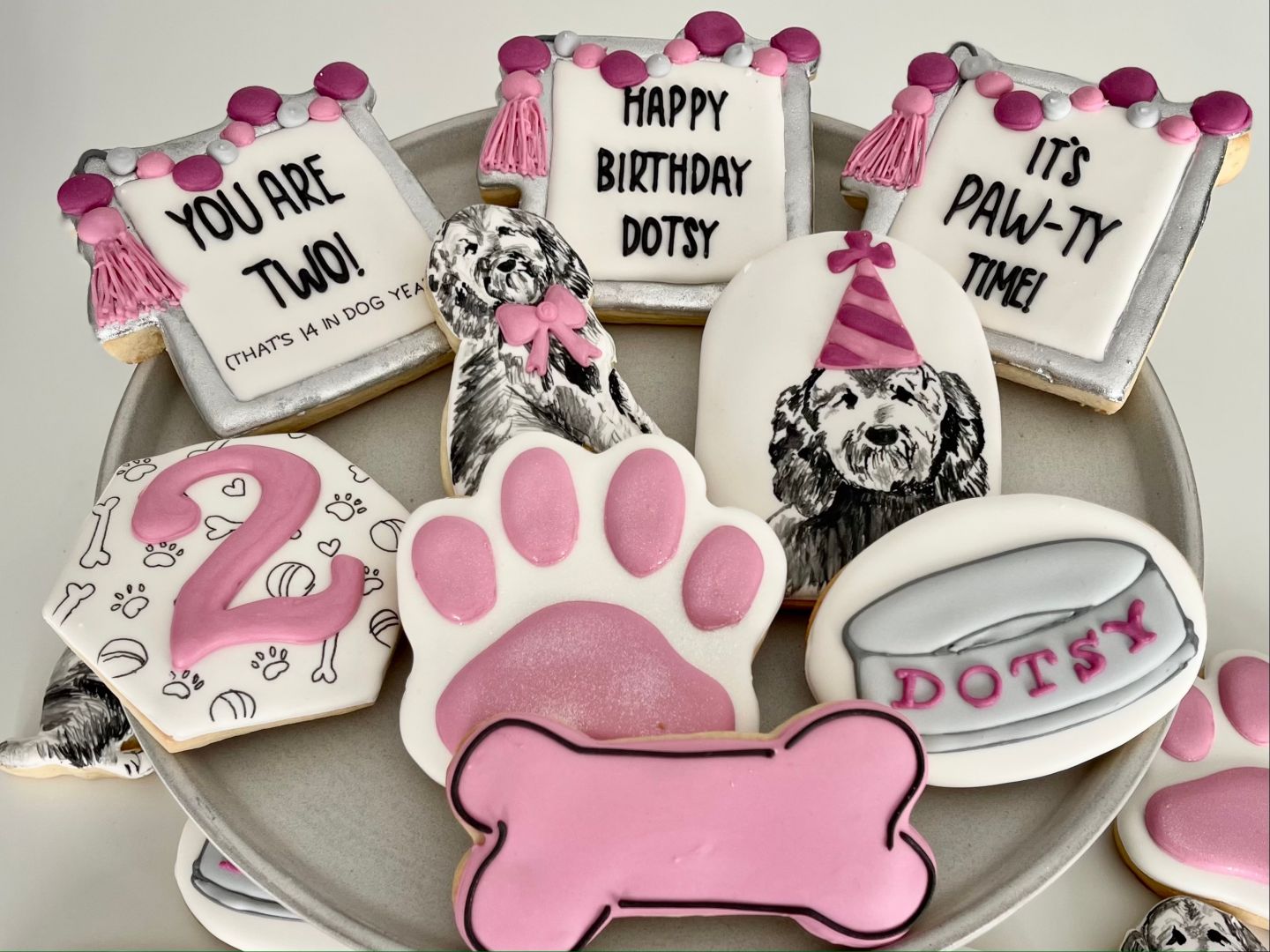 My favorite sets to make are my “Ultimate Cookie Note”. These sets involve a lot of input from the customer and the friends and family of the receiver. Each cookie is designed to represent something about that person, a memory, an inside joke, an anecdote- whatever the customer wants!. They make such a personal gift and I love hearing about the receiving person’s reaction. It really does make my heart full.