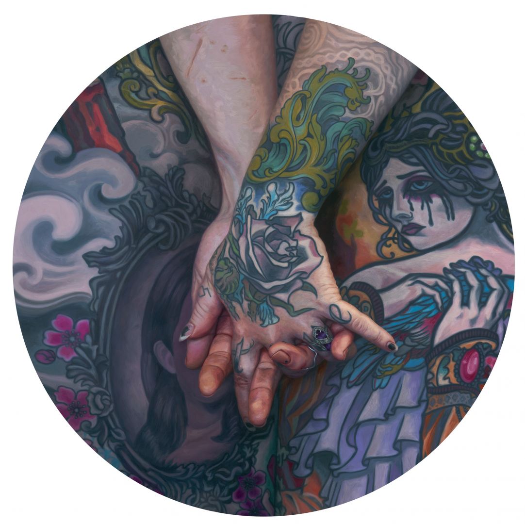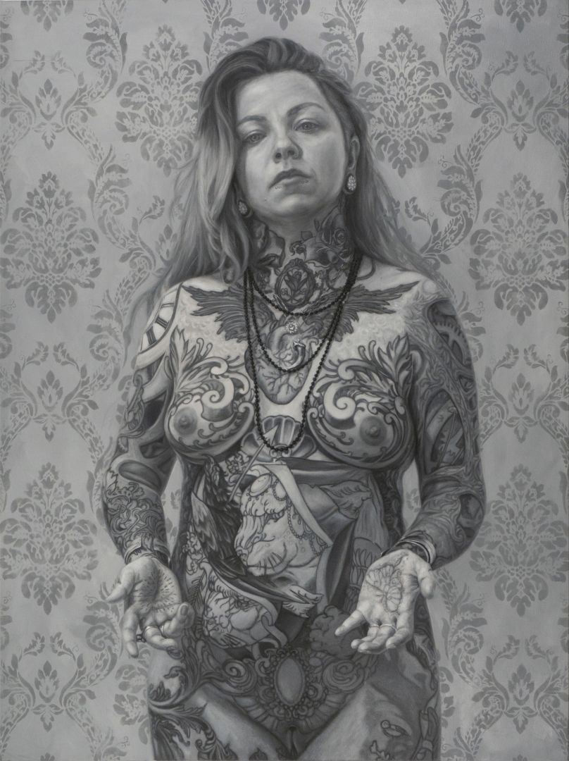 I’ve mostly focused on contemporary figurative work and portraiture, with a heavy focus on punk/goth/alt subculture and tattoos/body modification. My work is mainly of tattooed people, family members, friends, and self portraits. Marks on flesh (scars, tattoos, wrinkles, stretch marks) can often reflect an individual’s psychology (confident, defiant, unsure, shielded) and mirror the language of visual art (delicate, violent, corrective, transparent). I am fascinated by the ways we represent and express bodily autonomy, and how our experiences can inform our visual and emotional identity. It’s something I feel is worth capturing in visual art, and as a generally antisocial person, it’s a way for me to spend time with those I hold most dear, or in the case of my self-portraiture – intimate confrontation with my own body dysmorphia, mental state and inner workings.