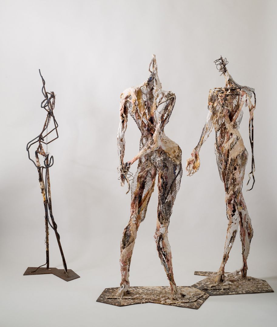 I am a figurative sculptor. All my work depicts the human body or refers to it. I work from direct observation of life, by working with live models. My early work was more realistic: traditional figure studies in clay, plaster and bronze. The newer pieces are more expressionistic: mixed-media open forms, but always recognizable as coming from the human body. My fascination with the human form stems from my early days as a dancer. I love the way the body moves- the lines, the shapes it makes as it moves in space, its strength, as well as its fragility, but especially, its energy. This dynamic is what I strive to express in my work.