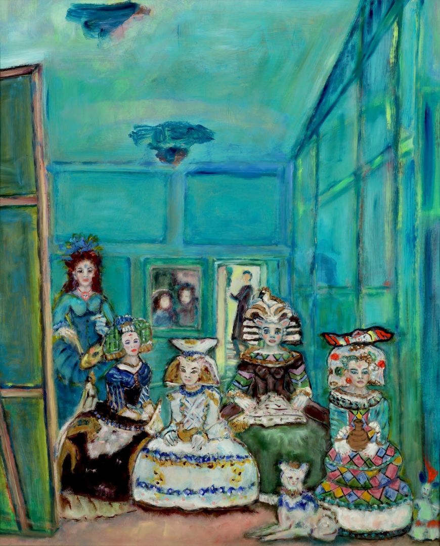 “Las Meninas” followed me to the studio, making their way into my ceramic sculptures and then onto canvas. These reinterpretations of Velasquez’ painting culminated with my painting and series titled “Ladies-NOT-Waiting” , where I have replaced Velasquez’ figures with my ceramic figures, his self portrait as artist with my self portrait as artist.