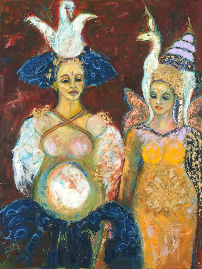 Tsipora is my Hebrew name and means “Bird”. “Tsipora, A Place to Land” looks deep into the parts of birds we envy and emulate: flight, travel, freedom and movement as well as settling, nesting, making and growing. . Their surfaces reference ancient sites from Cambodia, Europe and Mexico. With covid, they entered a time of reflection and self reflection. They became pregnant – pregnant with life – adorned with birds and flowers, surfaced in gold, white and fragmented mirror.