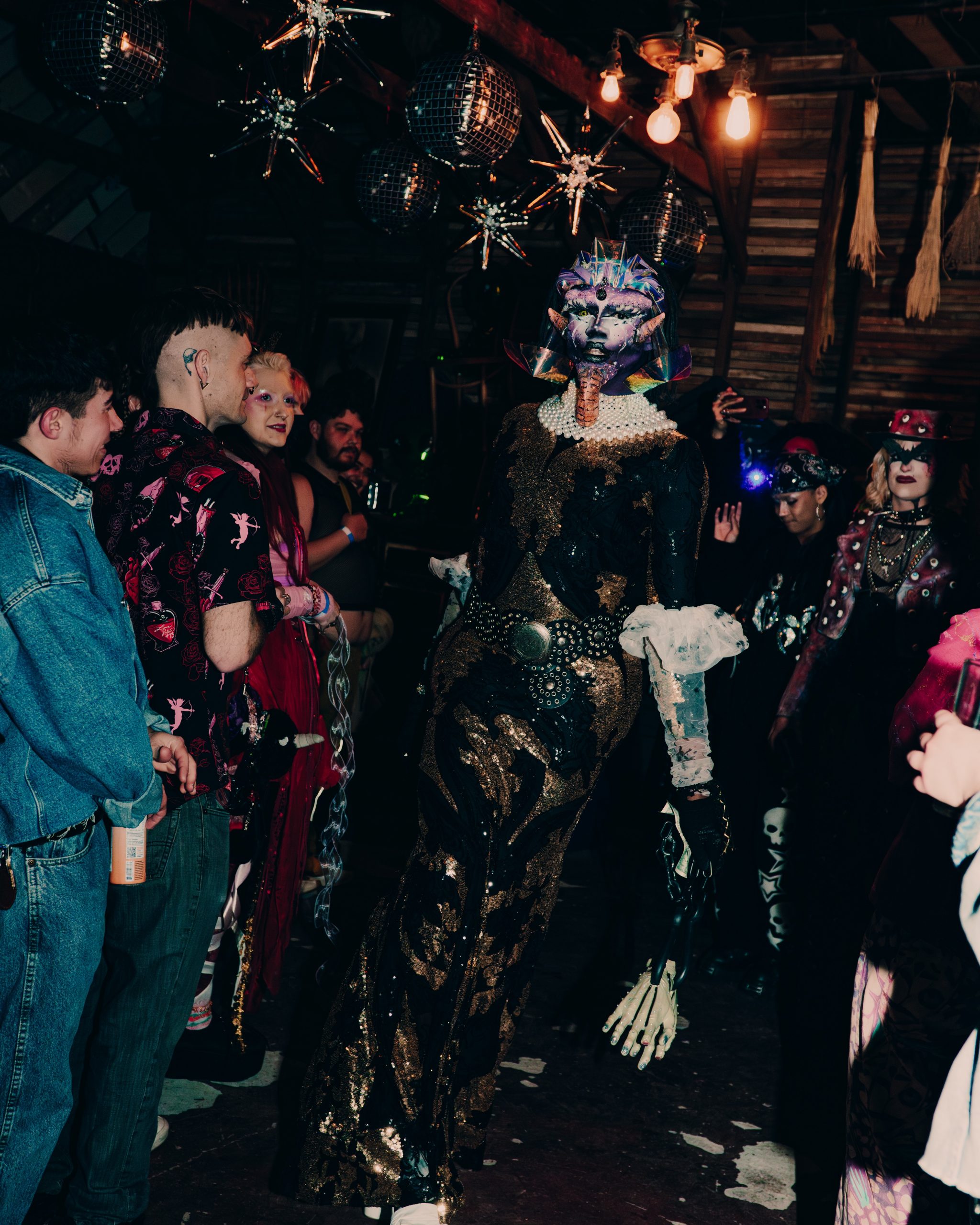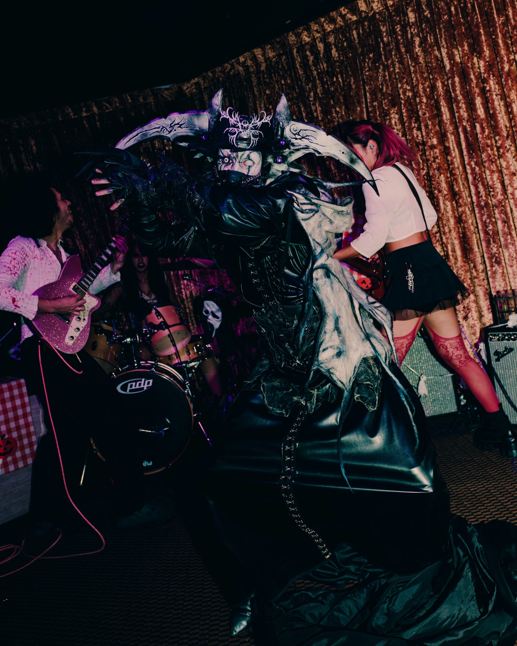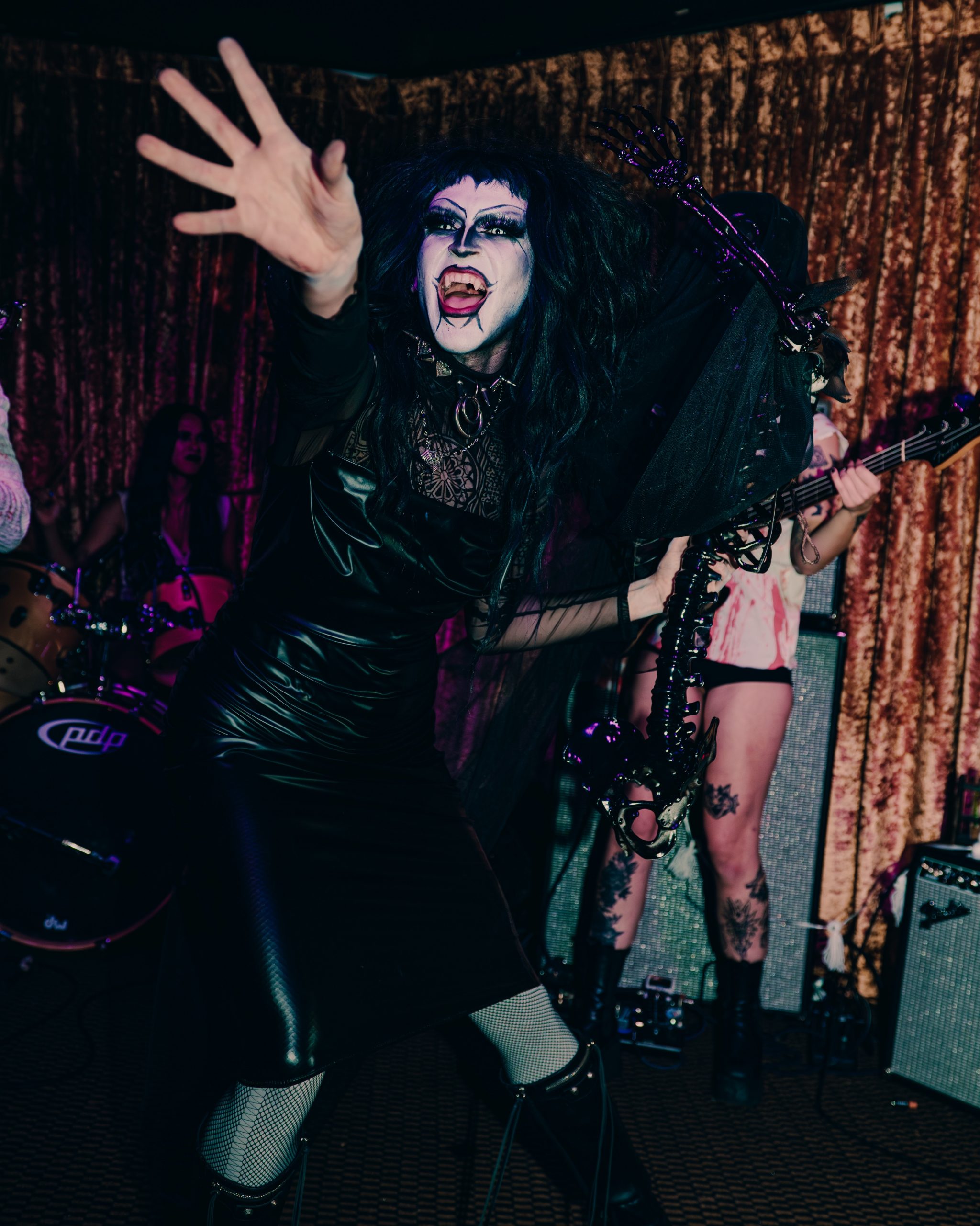One of the main thought processes behind it had come from Dragula’s Monster of Rock episodes. These episodes would feature the drag artists becoming rockstars and would include a challenge where they would have to perform as a band. The looks and outfits were always stellar, but they would be air playing their instruments for it. That had always been my favorite challenge, but I couldn’t stop thinking of how cool it would be if they actually played their instruments. Then, I saw Dragula live on tour, and during the set, Blackberri came out and did a My Chemical Romance number. The crowd went crazy with screaming the lyrics while they performed. It was truly so endearing to find a queer, gothic community as I had felt seen in ways I never did before! I LOVED it, but was once again, I was hit with the thought of “it would be cooler if this was done with a live band”. So that was the base inspiration behind it all!