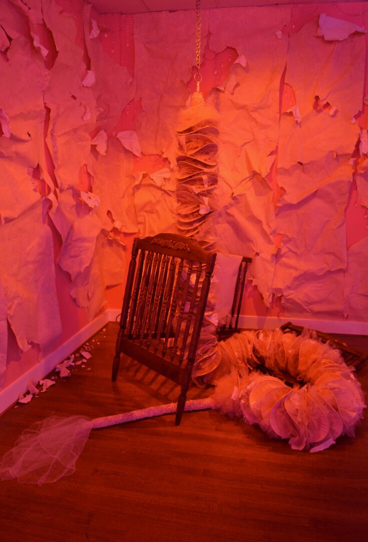 I am an ‘unconventional’ fiber sculpture artist pursuing themes of feminism that delve into topics of beauty, anatomy, and women’s inequality. I embed personal narratives through material context and nostalgic visual languages. Subverting the spectacle of decoration I push the seductively beautiful towards the overwhelming artificial. Combining, recontextualizing, and reconfiguring disparate materials is my way of reconciling my role as a woman and challenging the societal expectations ingrained in us all.