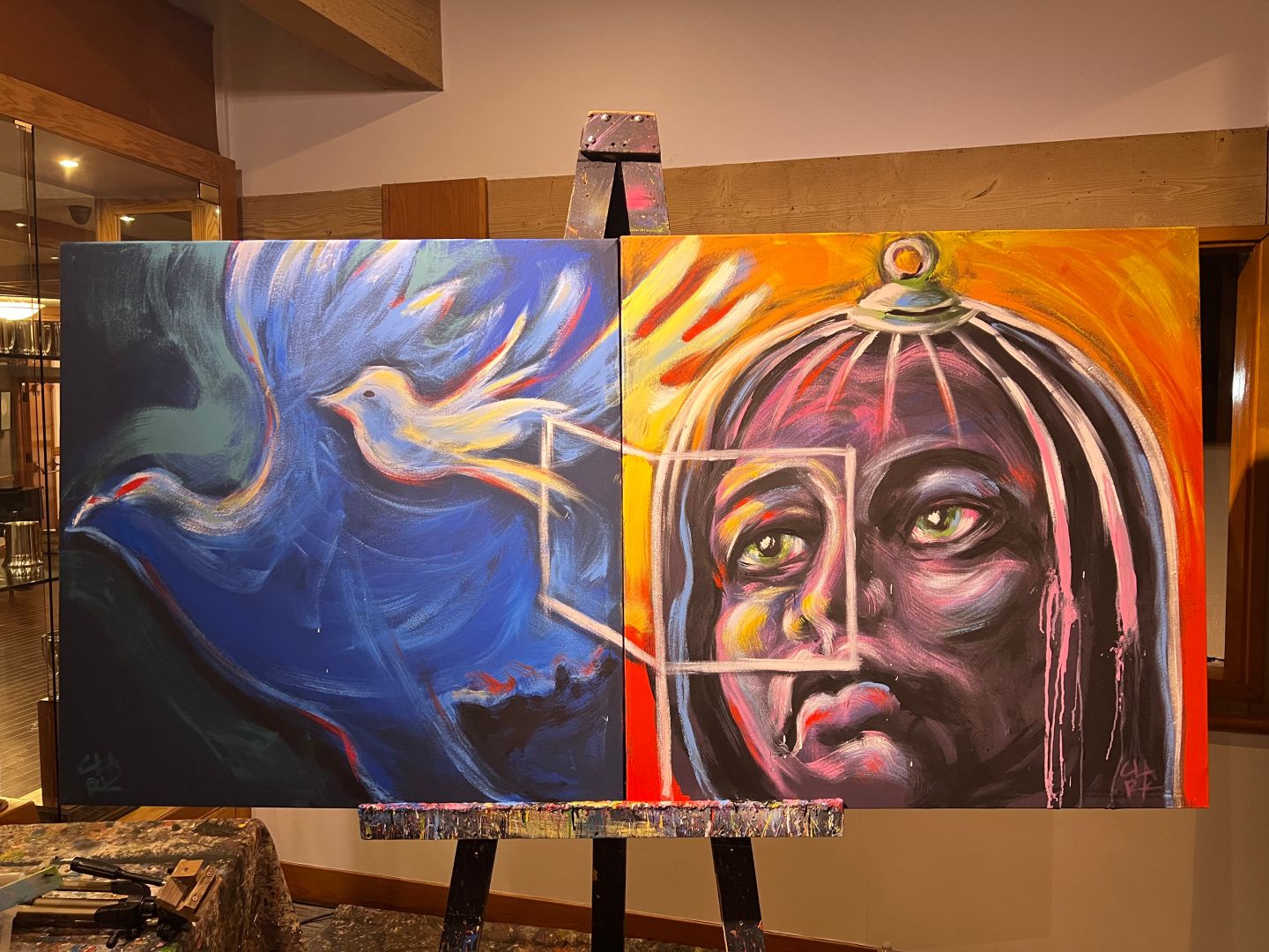 I recently painted live at a fundraiser for Exodus Cry, an important organization that exposes and helps change laws to combat the horrors of worldwide sex trafficking through provocative filmmaking and social media. So, the risk I faced was creating an image, that was to be live auctioned to raise money, that was not too dark or exploitative and would be something someone would be willing to buy and hang on their wall. So, I chose not to ignore the enslavement issue, but to make the painting hopeful and transformative. One side of the painting started with a young woman’s face looking up, suggesting her anticipating a future of promise. I then painted a birdcage and vivid red background around her to suggest the trauma and her freedom taken away. Next, the cage at the bottom begins to melt away and a wire door is opened and a young bird is released to freedom. A large eagle in the background symbolizing an organization like Exodus Cry escorts it to safety and mentors it in its journey back to normalcy. The painting raised $5,200 for the organization.