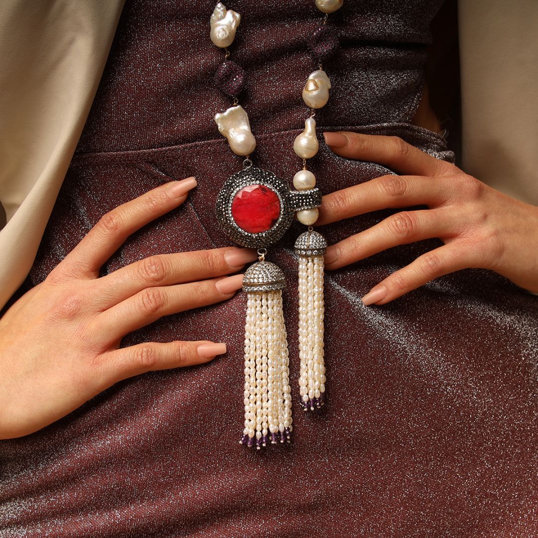 It’s mostly by watching my mother do her shopping for sarees and jewelry that I learnt how to mix and match colors and jewelry patterns that are not common combinations. The stories she would tell me about her mother, my grandmother helped me develop an eye for fashion and colors. I guess it is safe to say that it is kind of in my DNA… in the 30s and 40s my grandmother was very avant-garde and a style icon in her city. Even before Fashion Week existed she would tell her tailor to make an outfit inspired by a movie she saw and she turned heads wherever she would go with her sarees and would always mix match her gold jewelry. My mother was the same. She would place custom orders at the stores for sarees and gold jewelry with unusual color combinations that would throw off and surprise the sales people, and they would even warn my mother that it was not going to look pretty etc. She would be so sure of her choices and of course the results were always amazing, and the store would order more and sell out each time. She was a trend setter and couturier herself. She would tailor clothing for herself and us (me and my brother) that would always have a wow factor jewelry. My mother had a very keen eye for fashion and what would be trendy in the future. So, I grew up observing all this and unconsciously soaking it all in. Ultimately, this is what led me to combine saree raw silk and jewelry techniques.