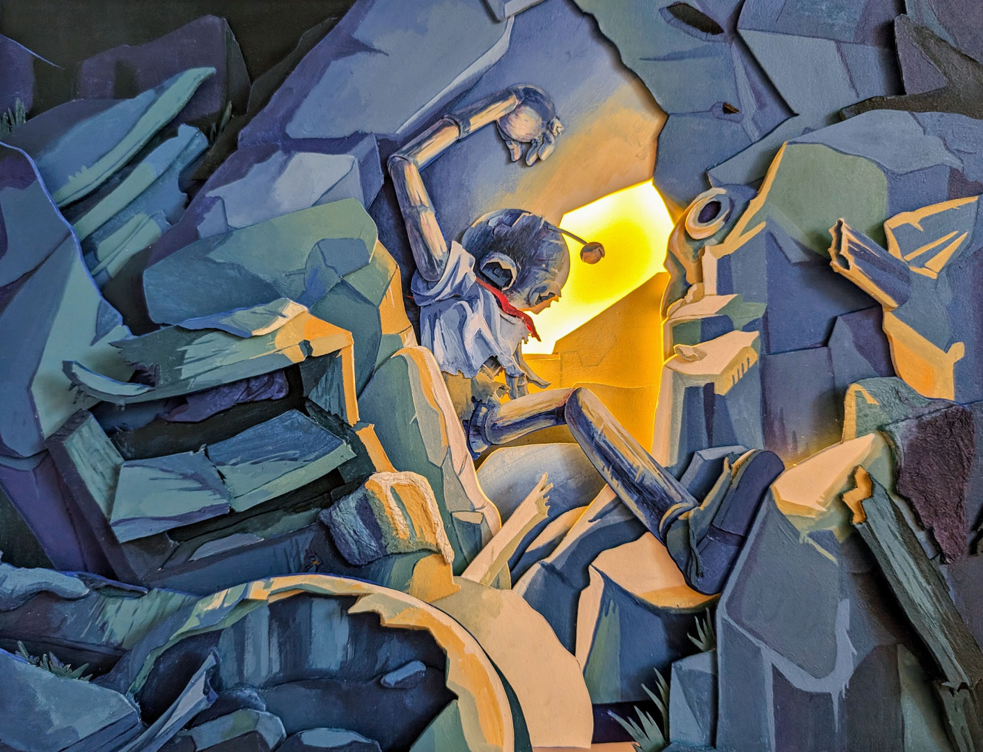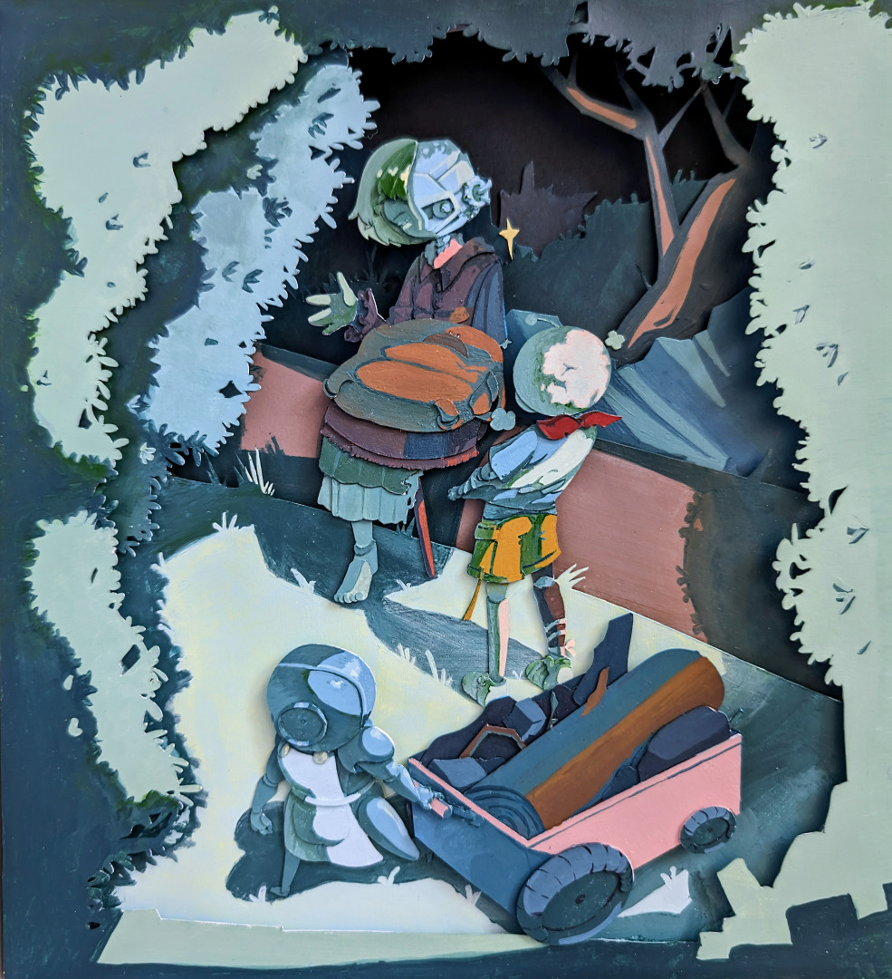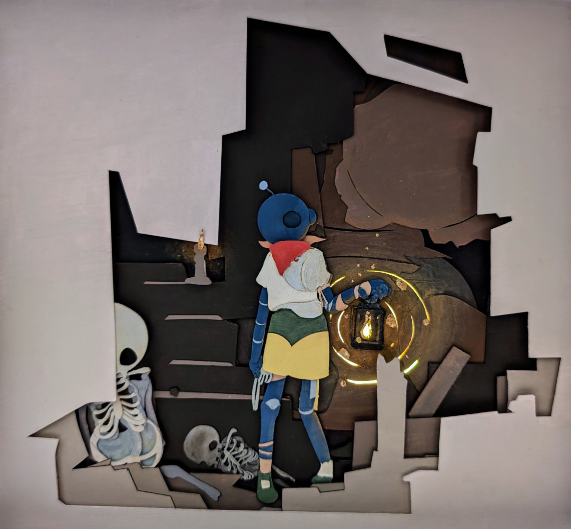 Now, my work continues to reflect that spirit. I create collage-inspired pieces that explore identity, growth, and human connection. I build small, layered worlds that viewers can enter—works that invite curiosity, imagination, and emotion. My creative process often involves combining traditional materials with digital influence, taking inspiration from internet culture and transforming it into something tactile and personal.