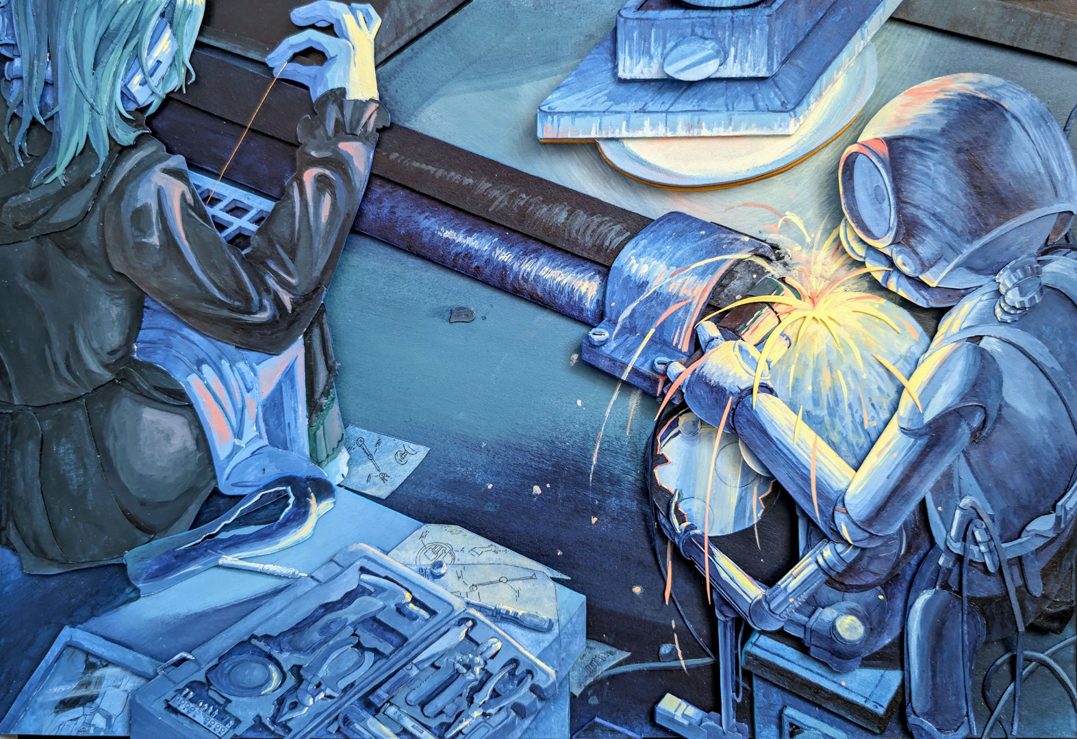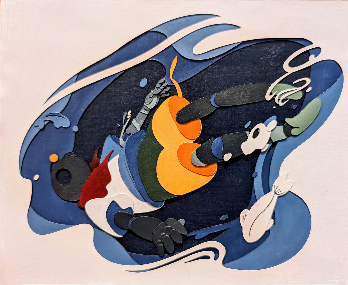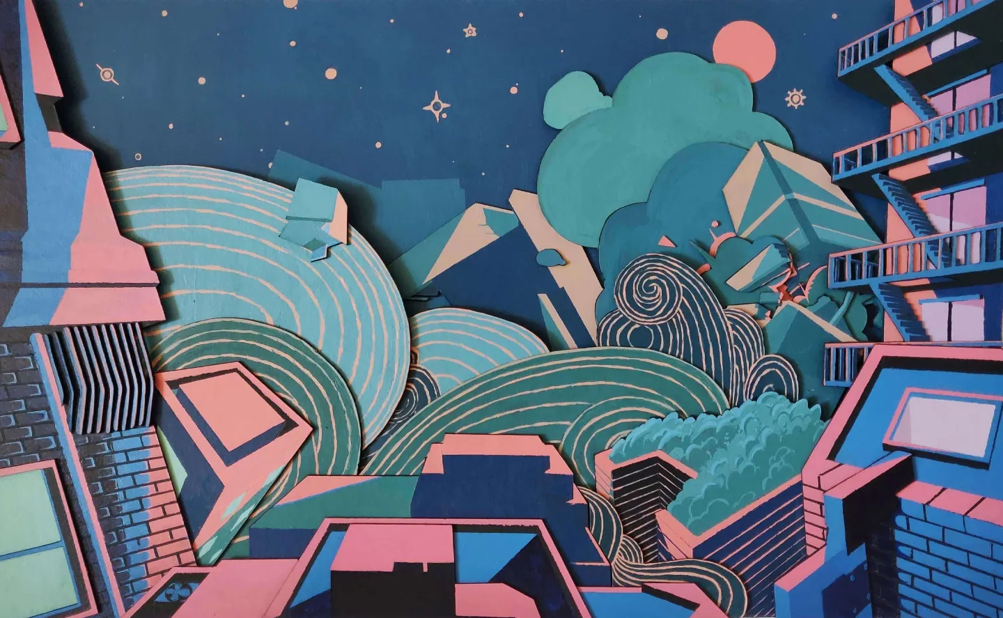 Now, my work continues to reflect that spirit. I create collage-inspired pieces that explore identity, growth, and human connection. I build small, layered worlds that viewers can enter—works that invite curiosity, imagination, and emotion. My creative process often involves combining traditional materials with digital influence, taking inspiration from internet culture and transforming it into something tactile and personal.