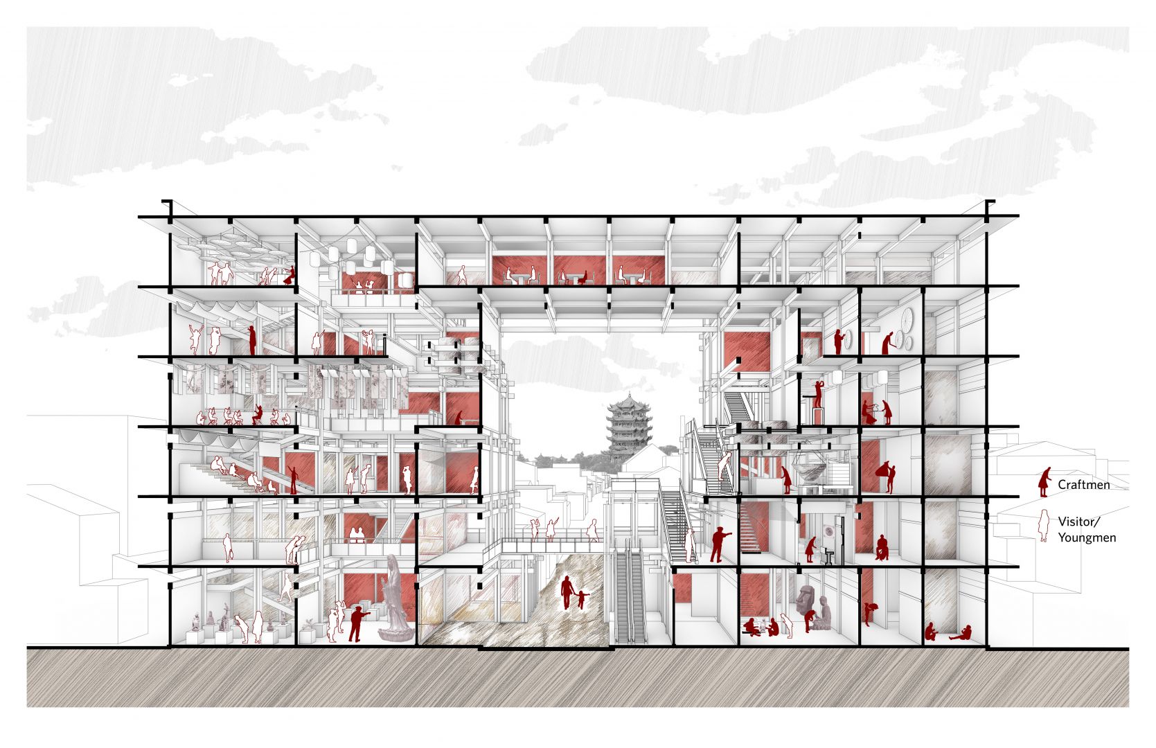 One of the projects I would like to mention is Wuhan Craftsmanship Center. This is a cultural center that support craftsmen living in Wuhan city. Many craftsmen live and make a living here for years. They created beautiful culture and artwork that contribute significantly to the city’s rich history and culture. But they are also facing challenges of losing their space in the city because of rapid urbanization. In response, I proposed a culture center building in a historic neighborhood, Tanhualin Road, to provide studio and living space for the craftsmen. The interior space is designed based on my research and interview with the craftsmen. This building not only creates space for the craftsmen’s needs but also provides a platform to foster meaningful interaction between the craftsman and the city.