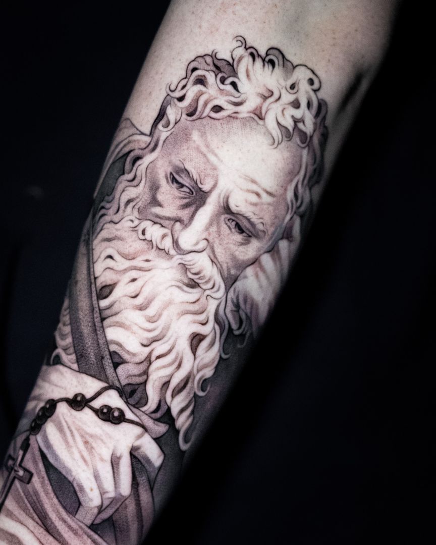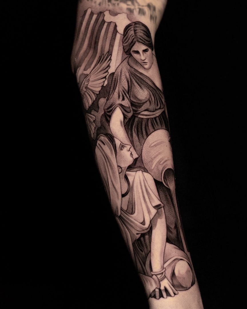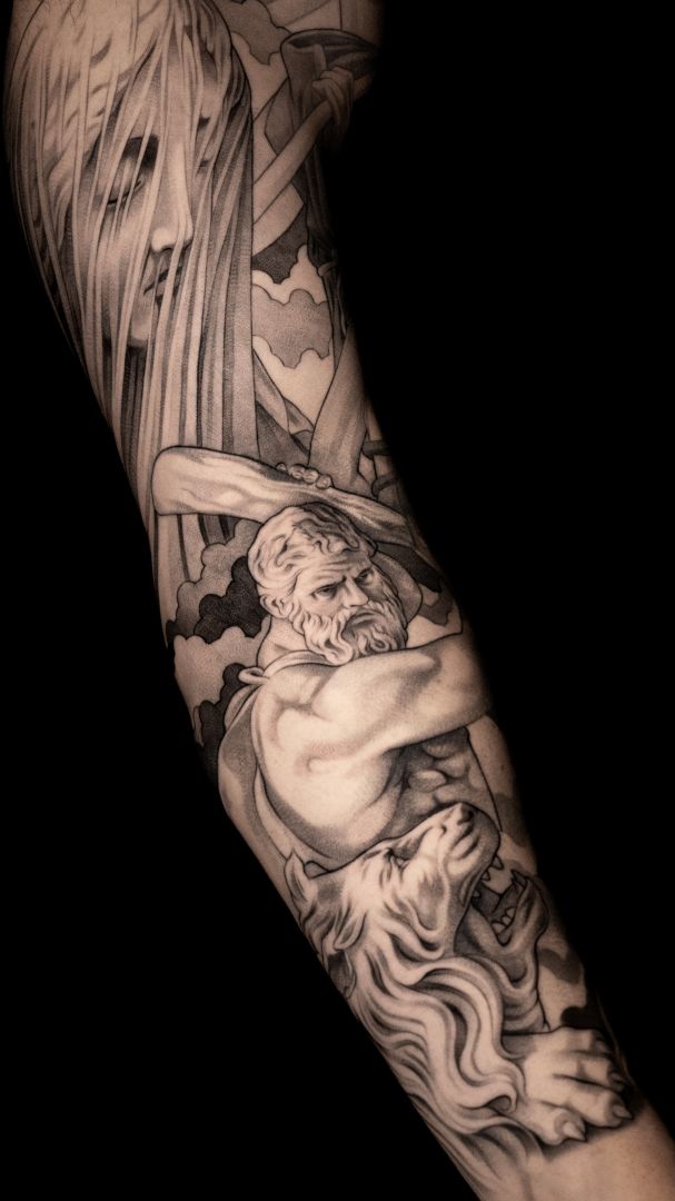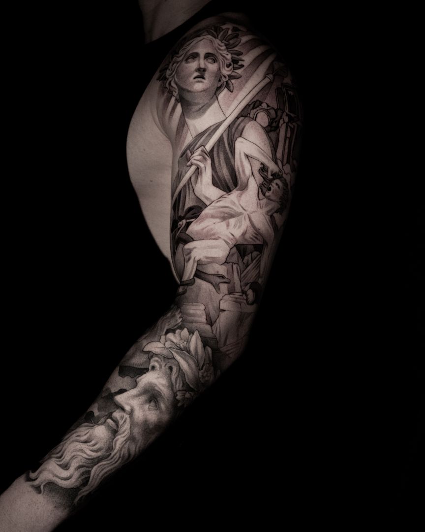 My tattoos, my art is inspired by the timeless works of the old masters. The deep engagement with the Craft is incredibly important to me and determines my work process. This will to advance as deeply as possible into the art and to explore all its facets, led to my art studies in Hamburg. Through this intense exploration, I have developed a personal style that I work on daily and strive for perfection. As with the old masters, it is not only the end result that is important to me, but the process that led to it. On the journey to the final result there are many questions to answer and decisions to make. I devote a lot of attention and time to these questions and decisions in order to achieve a unique goal. For this quality I had to make many sacrifices, such as the long distance to my family and friends, as well as the rare time off. My art accompanies me everywhere, it is all present and I am always working to improve it. Even if I don’t have a pencil or a tattoo machine in my hand right now, my head and eyes keep working and looking for more inspiration and potential for improvement. I want my clients to experience this intense process for themselves and that’s why I devote so much time and attention to it. This is the only way I can capture their ideas and stories in their most honest form and turn them into images.