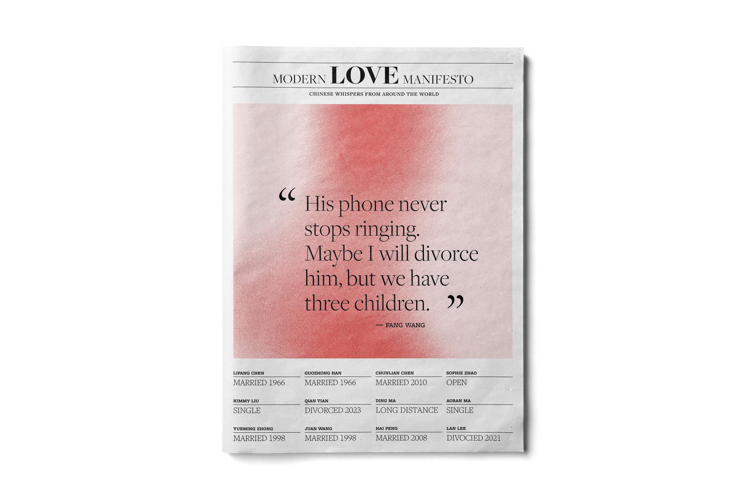 Modern Love Manifesto is a project to tell a story about love. In my twenties, my personal and friends’ experiences with love made me curious about how modern relationships differ from those of previous generations. This curiosity led me to interview people and create posters that showcased contemporary views on love. I used abstract silhouettes with colors, and typography to express each “manifesto” about love.