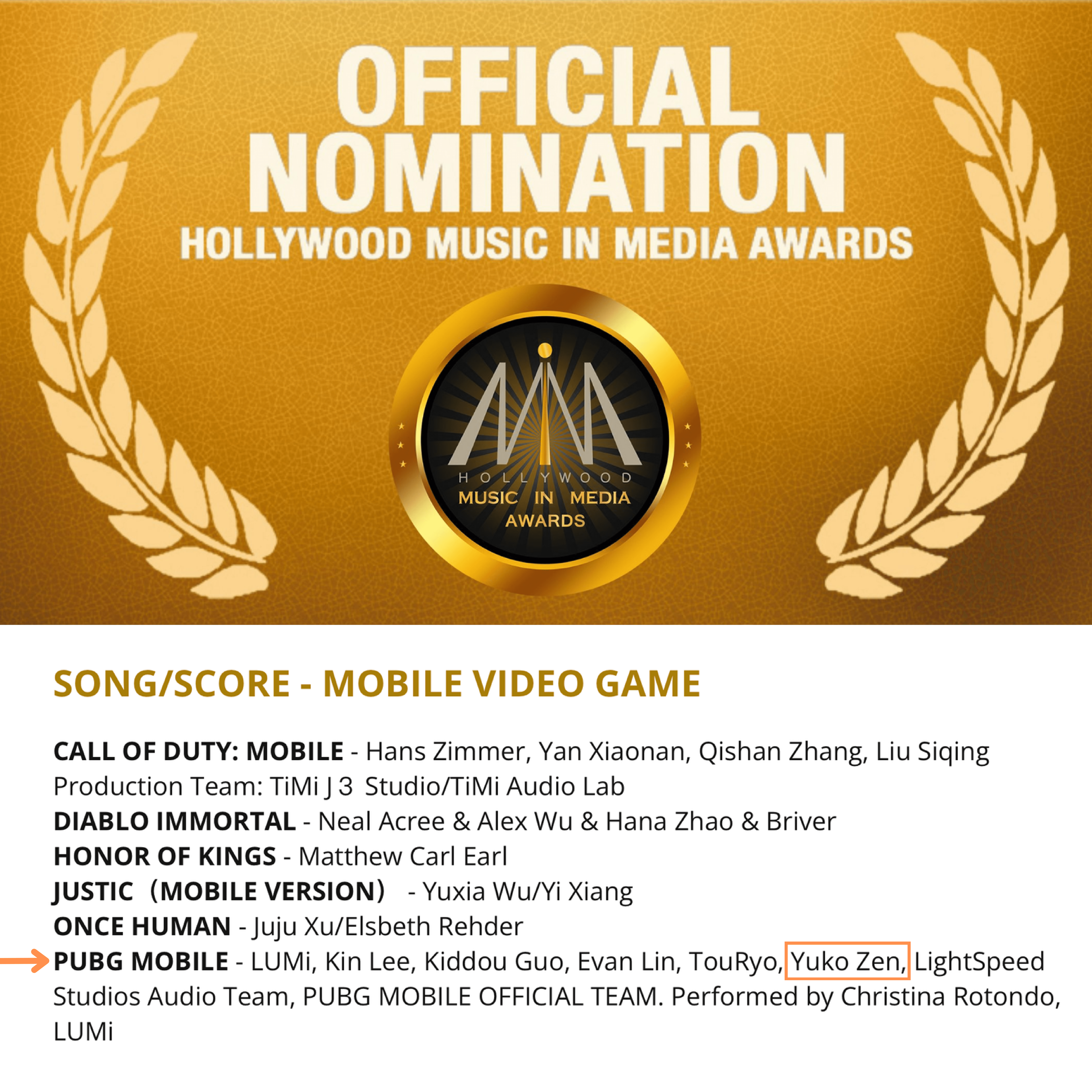 My team and I have been involved in creating music for Tencent Games and other mobile games, including PUBG. This year, we are proud to have received nominations from the Hollywood Music in Media Awards (HMMA).