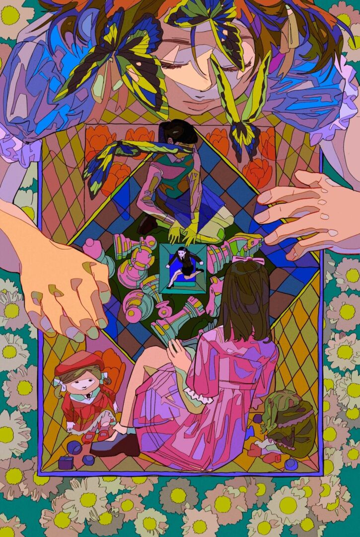 Many people ask me how I developed my current style, and I always say that I draw what I am most passionate about. I enjoy having many elements in my artwork and exploring their relationships in terms of size and proximity. Everything has a clear, solid edge to emphasize their graphic shapes and the negative space between them. I also use colors in ways that are not typically seen in real life. It is the balance among all the elements in a drawing that satisfies me and forms my style, which can be described as decorative and psychedelic.
